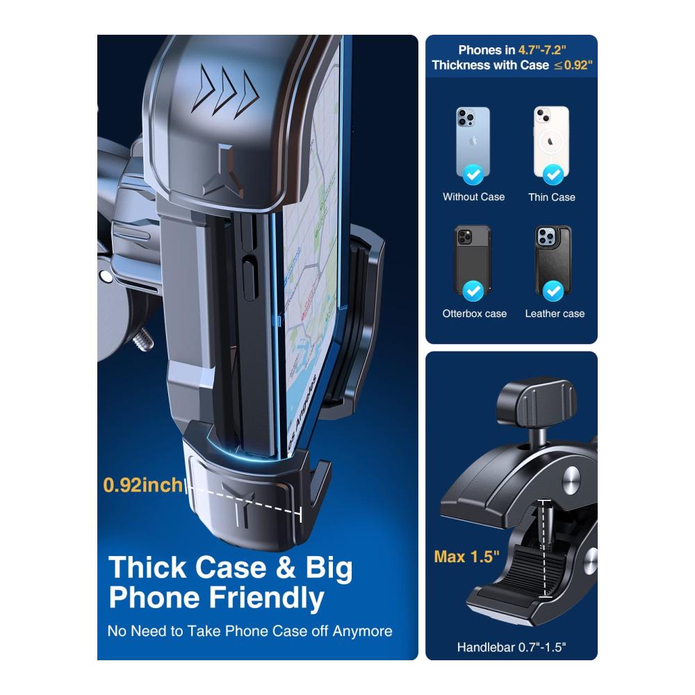 Sichere dein Smartphone während der Fahrt mit der Handyhalterung Motorrad, die speziell für Motorrad-Halterungen entwickelt wurde. Die Halterung ist kompatibel mit einer Vielzahl von Telefonen, einschließlich iPhone, Samsung Galaxy und mehr. Dank der soliden Konstruktion und der vibrationsdämpfenden Polsterung bleibt dein Telefon geschützt, selbst bei starken Beanspruchungen. Die einfache Installation ermöglicht es dir, die Halterung schnell an verschiedenen Fahrrädern zu montieren, während dein Lenker vor Kratzern geschützt wird. Mit 1 Jahr Garantie und lebenslangem Support.