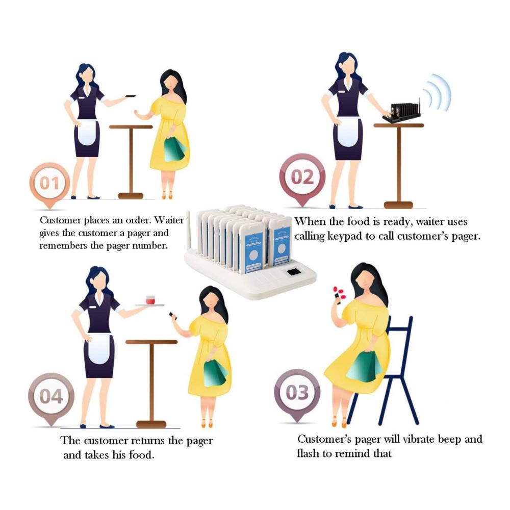 【MULTIFUNKTION】 Kann mehrere Pager gleichzeitig rufen. Geeignet für eine Vielzahl von Szenarien, ruhig oder laut; Restaurants; Hotels; Golfclubs; Spielplätze; Usw. Geben Sie Ihren Kunden die Freiheit, mit dem Restaurant in Verbindung zu bleiben. 48 Stunden Standby.