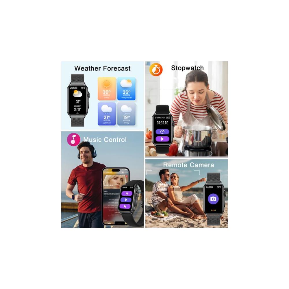 Anrufe annehmen/tätigen & SprachassistentMit einem eingebauten Mikrofon und einem High-Fidelity-Lautsprecher können Sie Anrufe empfangen/ablehnen/annehmen und die Lautstärke an der Uhr anpassen. Der Sprachassistent Ihrer Smartwatch kann Ihre Anfragen bearbeiten. | Intelligente ErinnerungenImmer wenn Sie eine Benachrichtigung, SMS, Anrufe oder Nachrichten von einer App (Facebook, WhatsAPP, Messenger, Instagram usw.) erhalten, vibriert die Uhr leicht und erinnert Sie daran, die Informationen auf dem Display anzuzeigen. | WettervorhersageSie können das Wetter vor Ihrer Abreise überprüfen und Ihre Uhr einschalten, um jederzeit eine Wettervorhersage in Echtzeit zu erhalten. |