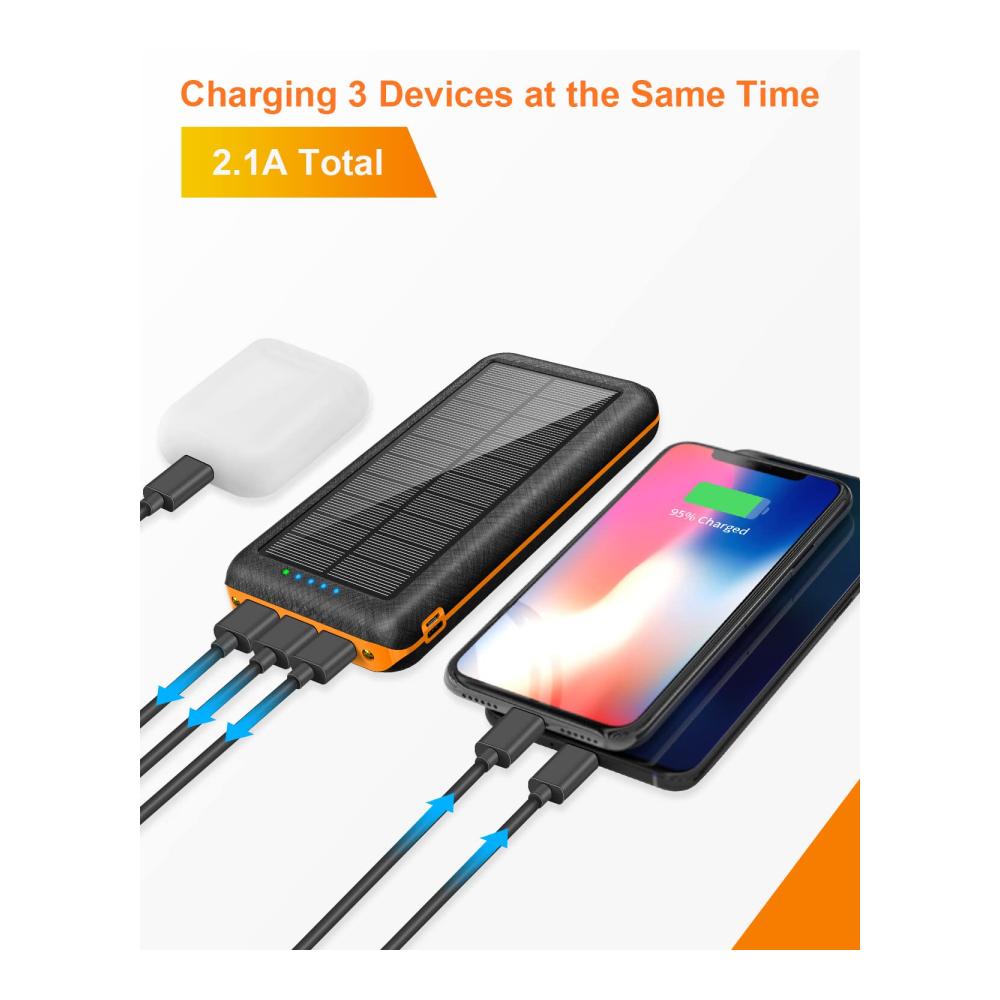 【USB & Solar-Lademodi】Das Solar-Handy-Ladegerät kann sowohl über USB als auch über die Solarzellen aufgeladen werden.Da die Ladegeschwindigkeit jedoch von der Intensität des Sonnenlichts und der Umwandlungsrate des Panels abhängt, kann es lange dauern, bis es aufgeladen ist. Daher empfehlen wir im Alltag das Aufladen über eine Steckdose, das Aufladen über Solarzellen ist nur für Notfälle gedacht. HINWEIS: Bitte laden Sie das Powerbank mit einem Adapter vollständig auf, bevor Sie ins Freie gehen.