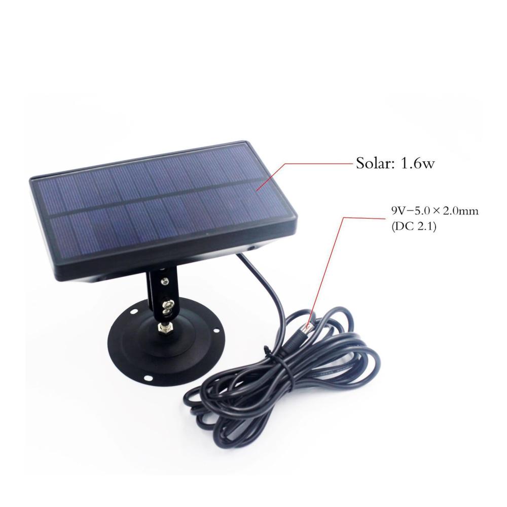 Modellparameter:Eingebauter Lithium-Polymer-Akku: 1800 mAhMaximale Ausgangsleistung des Solarpanels: 0,4 WAusgangsspannung: 9VMaximaler Ausgangsstrom: 1000 mAAusgangsstecker: 5,0 * 2,0 mm (DC2,1)Netzteil: Eingang AC110-220, Ausgang: 9 V 1000 mAMontage: Riemen/StativBetriebstemperatur: -22- 158F, -30- 70CBetriebsfeuchtigkeit: 5 % – 95 %Packliste:1 * Solarpanel1 * Zubehör (wie im Bild gezeigt)Betrieb:1: Schließen Sie den Solarstecker an die Kamera an, um die Kamera mit Strom zu versorgen2: Installieren Sie das Stativ an der Solaranlage und stellen Sie es auf einen Baum oder einen anderen Ort.3: Zum Aufladen öffnen Sie bitte zwei Schrauben und schließen Sie es mit einem USB-Kabel an den DC 5V 1A-Adapter (nicht im Lieferumfang enthalten) an. Das blaue Licht blinkt beim Laden und das blaue Licht blinkt nicht, wenn der Akku vollständig aufgeladen ist.Notiz:1. Bitte erlauben Sie 1-10 mm Abweichung aufgrund der manuellen Messung.2. Aufgrund von Licht- und Bildschirmunterschieden kann die Farbe des Produkts geringfügig vom Bild abweichen.