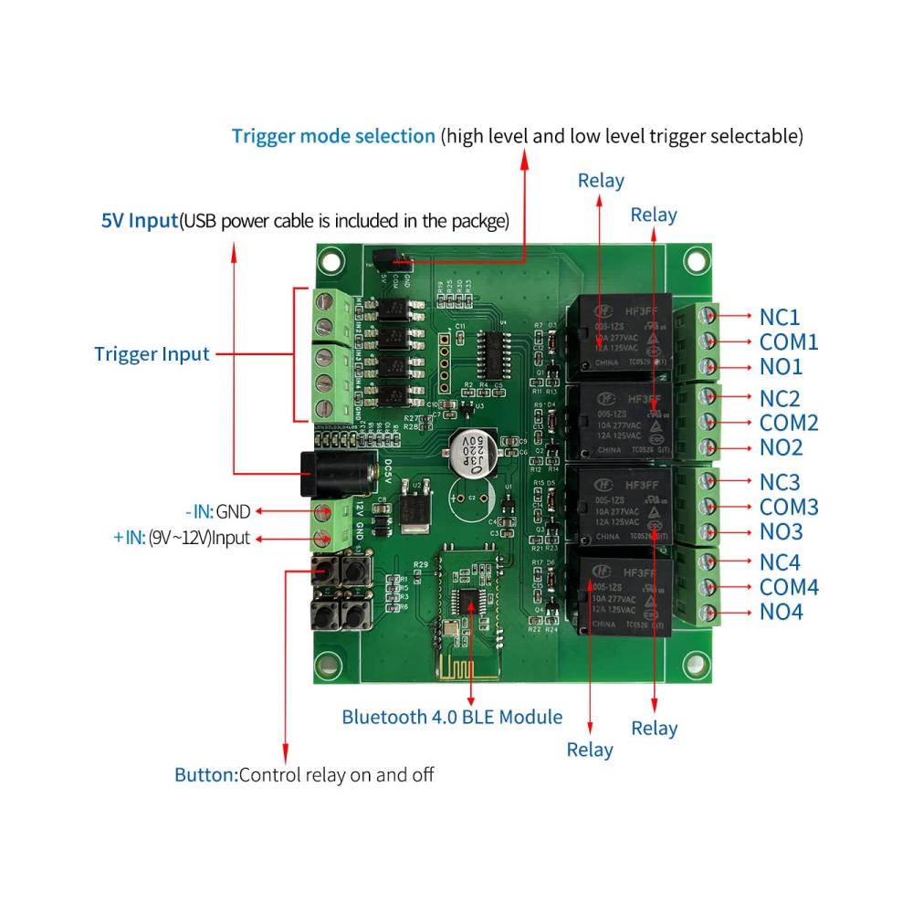 Unterstützt 5V und 12 Stromversorgung. Eingebautes 4-Kanal-Relais. Das Relais gibt nur Steuersignale aus und gibt keine Leistung direkt aus. Es kann DC- und AC-Schaltkreise steuern.