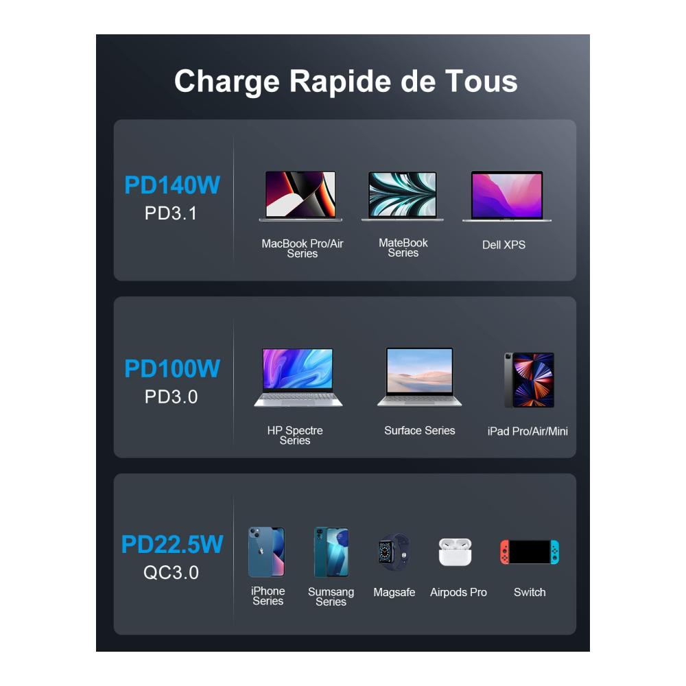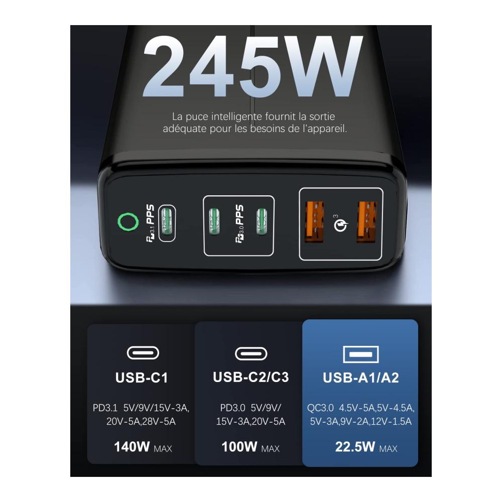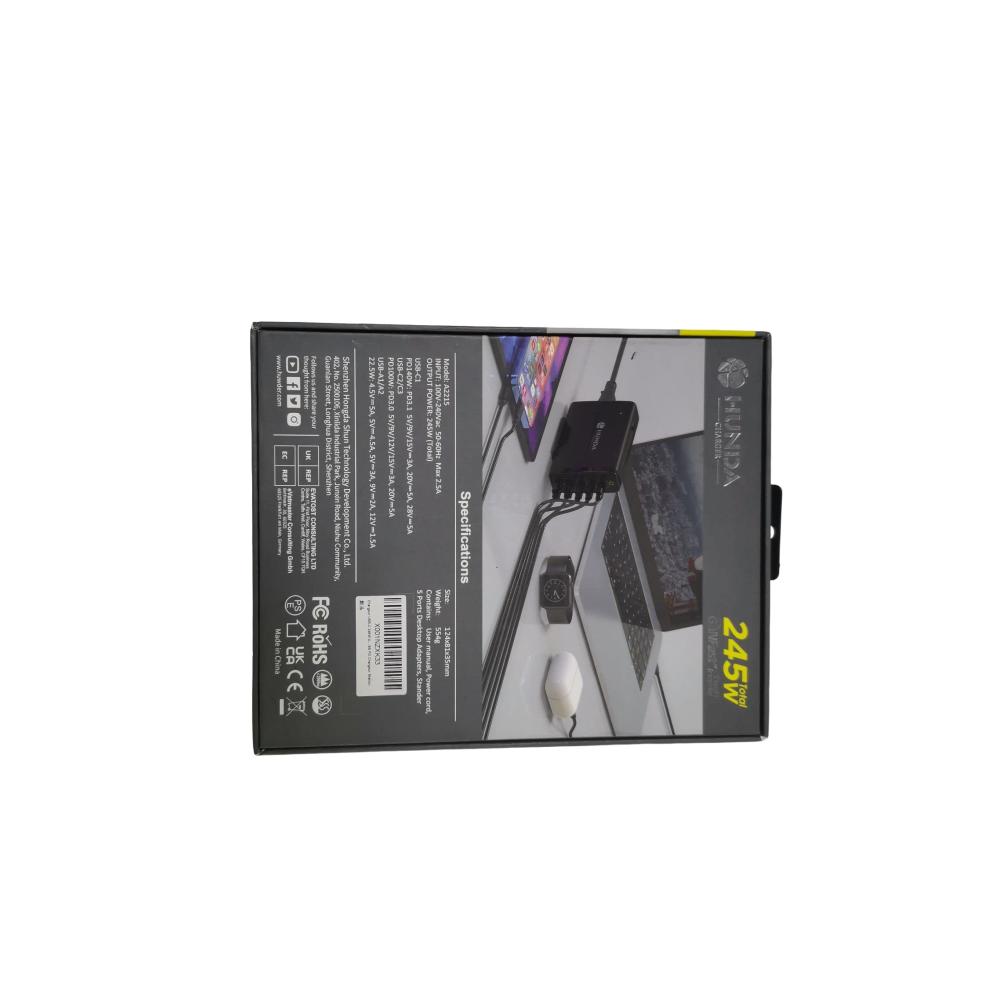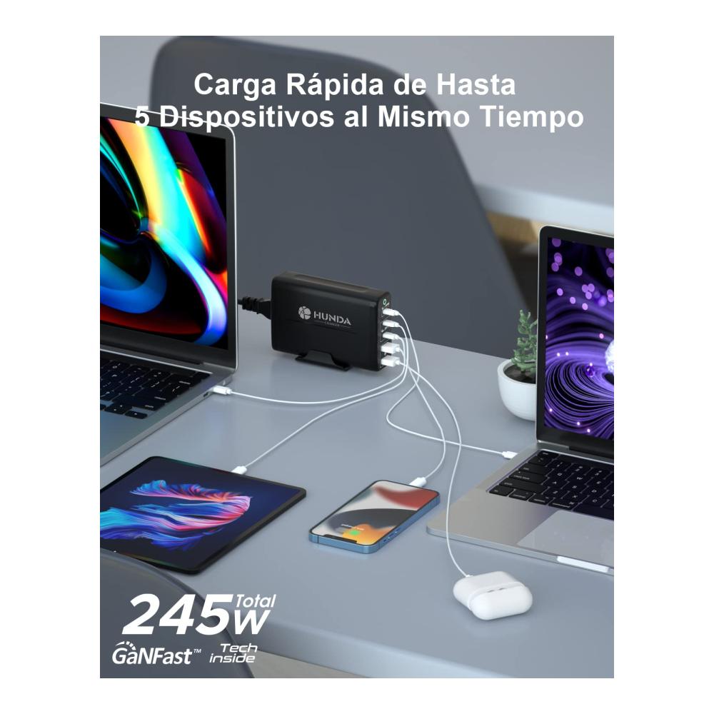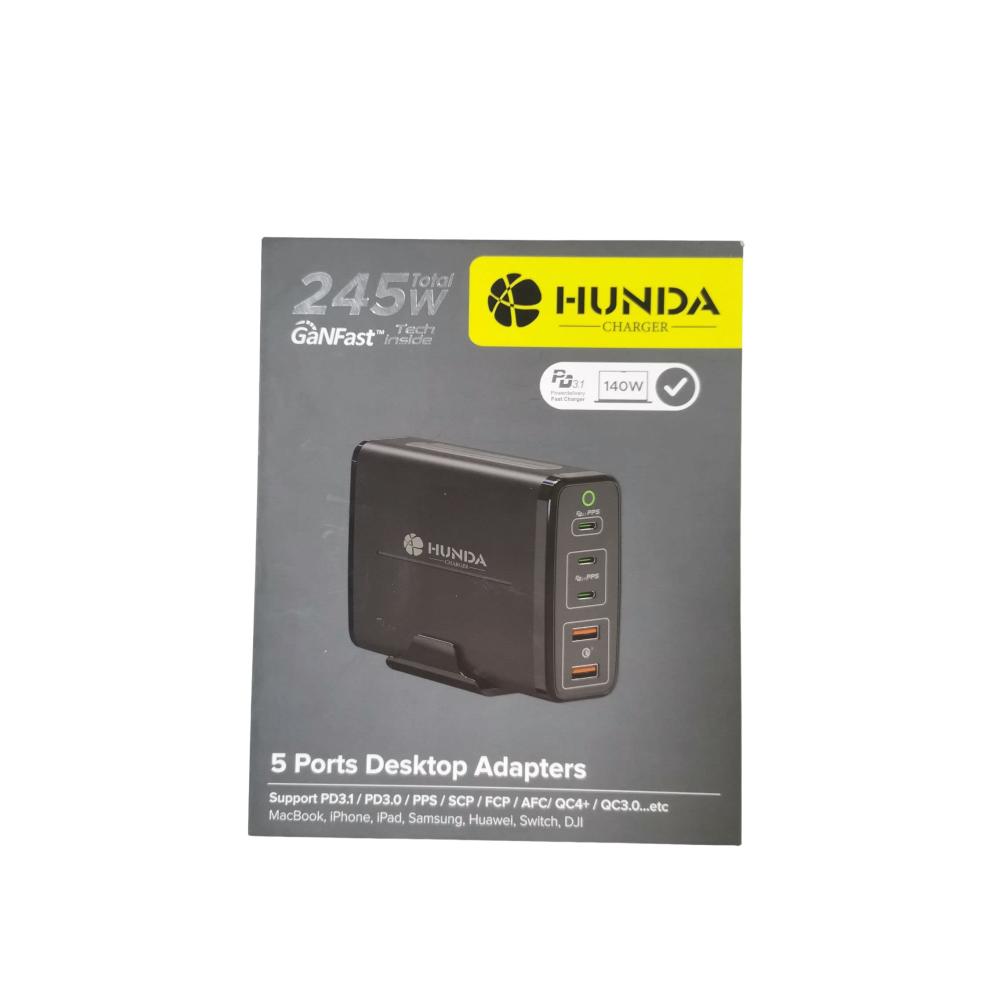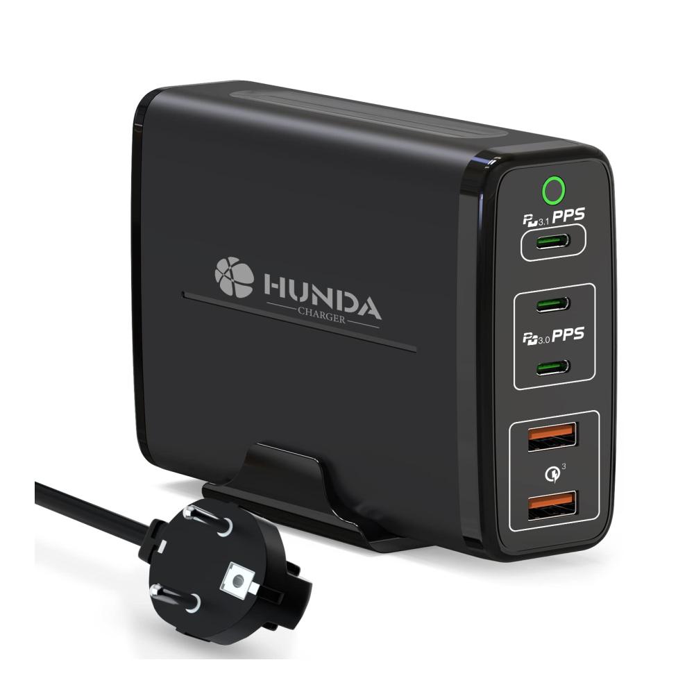 【5-in-1-Ladegerät für Schnelles Aufladen】Dieses USB-C-Ladegerät mit 245 W kann bis zu 5 Geräte gleichzeitig aufladen. Es verfügt über 3 USB-C-Anschlüsse (USB-C1: max. 140 W, USB-C2/C3: max. 100 W) und 2 USB-A-Anschlüsse (USB-A: max. 22,5 W). Sie können damit bis zu drei Laptops gleichzeitig schnell aufladen, was dem Besitz mehrerer USB-C-Ladegeräte gleichkommt. Darüber hinaus verfügt das Ladegerät über eine intelligente Energieverteilung, um die schnellstmögliche Ladegeschwindigkeit für Ihre Geräte zu gewährleisten. 【Upgrade auf GaN-Technologie】Das HUNDA USB-Ladegerät verwendet die GaN-Technologie mit einem integrierten 2Pcs-Chip, was ein schnelleres Aufladen, eine kleinere Größe und mehr Leistung ermöglicht. Darüber hinaus ist das Ladegerät mit mehreren Schutzmaßnahmen ausgestattet, wie z. B. Temperaturschutz, Überstromschutz, Überspannungsschutz, Überlastungsschutz, Überhitzungsschutz und Kurzschlussschutz. Da er CE-zertifiziert ist, bietet er einen umfassenden Schutz für Ihr Gerät. 【Große Kompatibilität】Dieses USB-C-Multiport-Ladegerät ist für alle elektronischen Geräte mit USB-C- und USB-Anschlüssen geeignet. Es ist kompatibel mit IT-Geräten wie MacBook Pro 16/14/13, MacBook Air, Dell XPS, HP, Surface, MateBook und unterstützt Smartphones wie die iPhone-Serie 14/13/12, Samsung Galaxy und andere sowie das iPad Pro/Air/Mini, Nintendo Switch, Steam Deck und andere Geräte mit USB-C-Schnittstelle. 【Schnelles, sicheres und zuverlässiges Aufladen】Unser 5-Port-Desktop-Adapter unterstützt mehrere Schnellladeprotokolle, darunter PD3.1/PD3.1/PPS/QC4 /QC3.0/SCP/AFC/VOOC/DASH/DCP/FCP/MTK/PE2.0. Unter anderem kann der USB-C PD3.1-Anschluss das MacBook Pro 16&39;&39; in weniger als 30 Minuten auf 50 % aufladen. Der USB-Anschluss verwendet die QC4.0-Technologie, die Schnellladung mit bis zu 22,5 W unterstützt – über 20 % mehr als QC3.0 – und kann in nur 30 Minuten vollständig aufgeladen werden, wodurch er sich ideal für den Einsatz zu Hause oder im Büro eignet. 【Packliste 3 Jahre Garantie】Das komplette Ladekit enthält: ein USB-C-Ladegerät mit 245 W, ein 120 cm langes Netzkabel, eine Ladestation und eine Bedienungsanleitung. Außerdem bieten wir 3 Jahre kostenlose Austauschgarantie. Wenn Sie während des Gebrauchs Probleme haben, kontaktieren Sie uns bitte und wir werden die perfekte Lösung bereitstellen. Mit unserem 245W USB-C Ladegerät mit GaN-Technologie laden Sie Ihre Geräte schnell und effizient auf. Dank der 5 Ports und der Unterstützung von PD3.1, PPS, QC4 und QC3.0 ist es perfekt für MacBook Pro, Dell XPS, HP, Surface, iPhone, iPad und Galaxy. Holen Sie sich jetzt dieses vielseitige Ladegerät für zu Hause oder unterwegs
