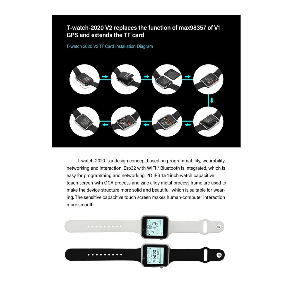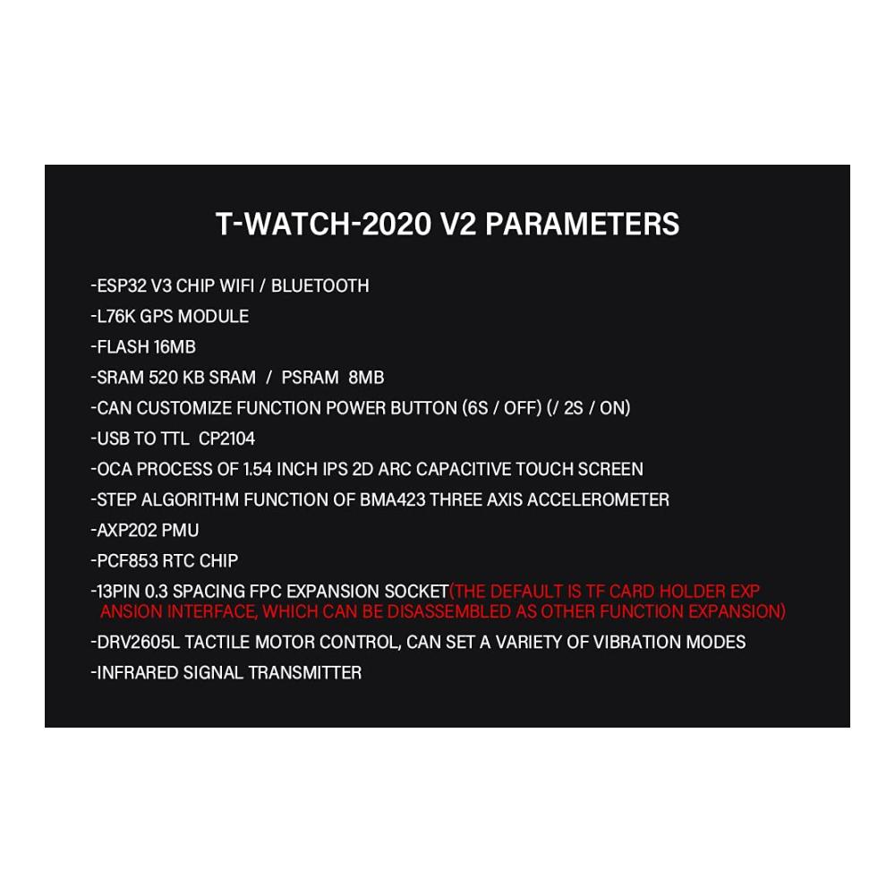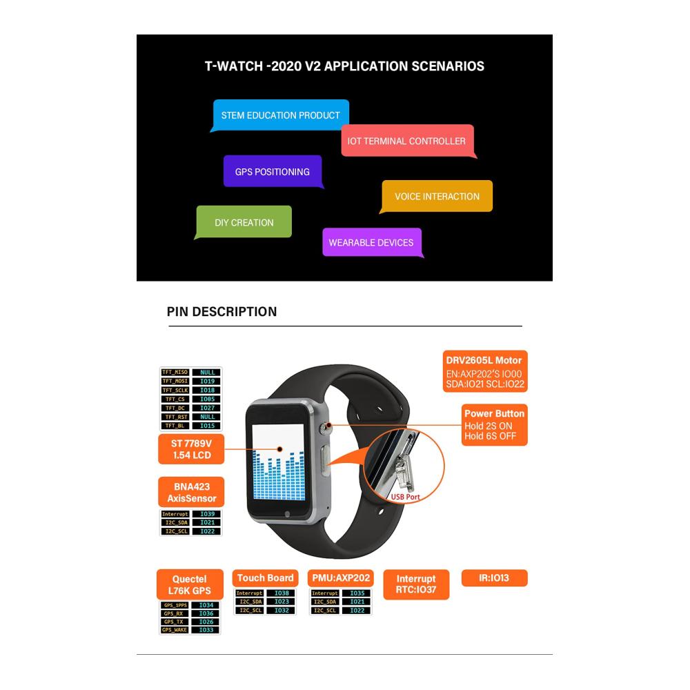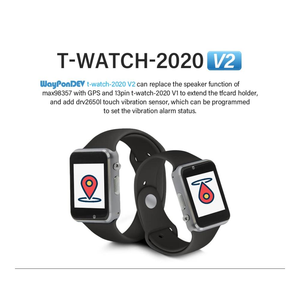 Die T-Watch 2020 V2 ist eine ESP32-basierte programmierbare Uhr in elegantem Silber, hergestellt von WayPonDEV. Dieses Entwicklungsboard bietet eine Vielzahl von Funktionen, darunter Dual-Mode-Bluetooth / WLAN, PMU-Energieverwaltung und einen kapazitiven 1,54-Zoll-IPS-LCD-Touchscreen. Mit Unterstützung für Entwicklungsplattformen wie ESP-IDF, Arduino und MicroPython können Sie Ihre eigene Software entwickeln und anpassen. Die Uhr bietet drahtlose Konnektivität über Wi-Fi und Bluetooth sowie eine Vielzahl von Erweiterungsmöglichkeiten. Erkunden Sie die Möglichkeiten dieser interaktiven Smartwatch und gestalten Sie sie nach Ihren Wünschen.