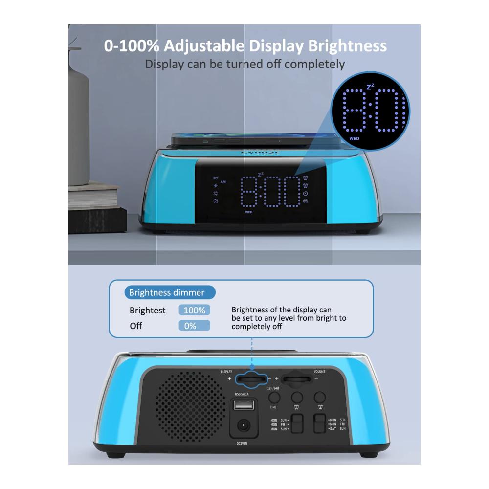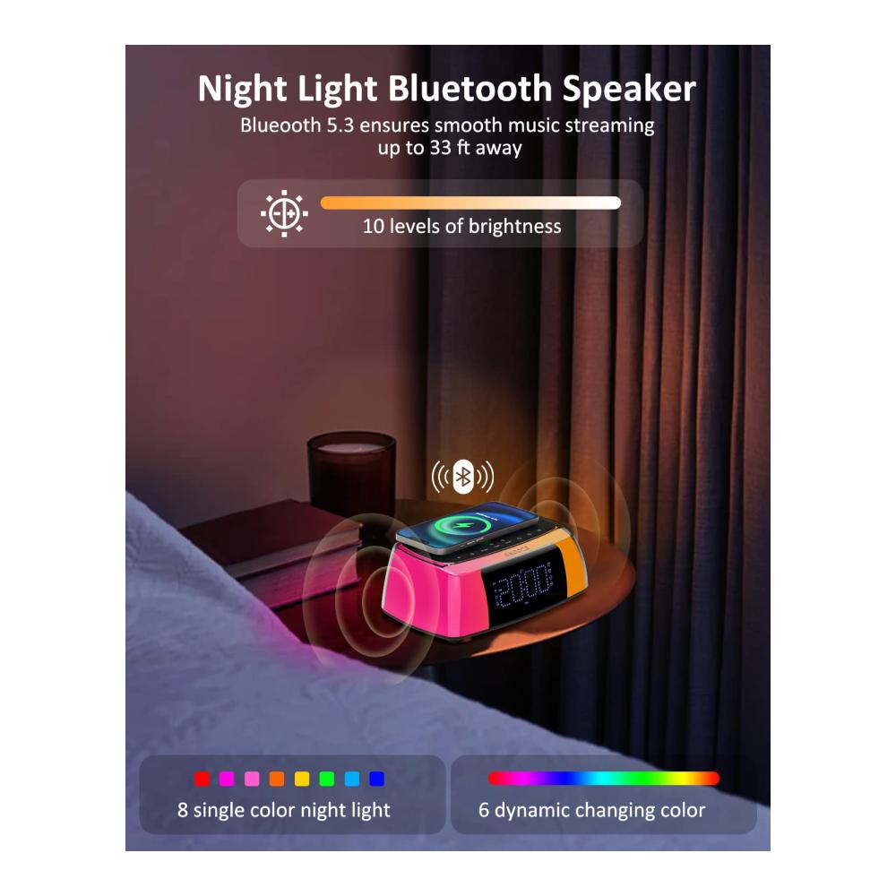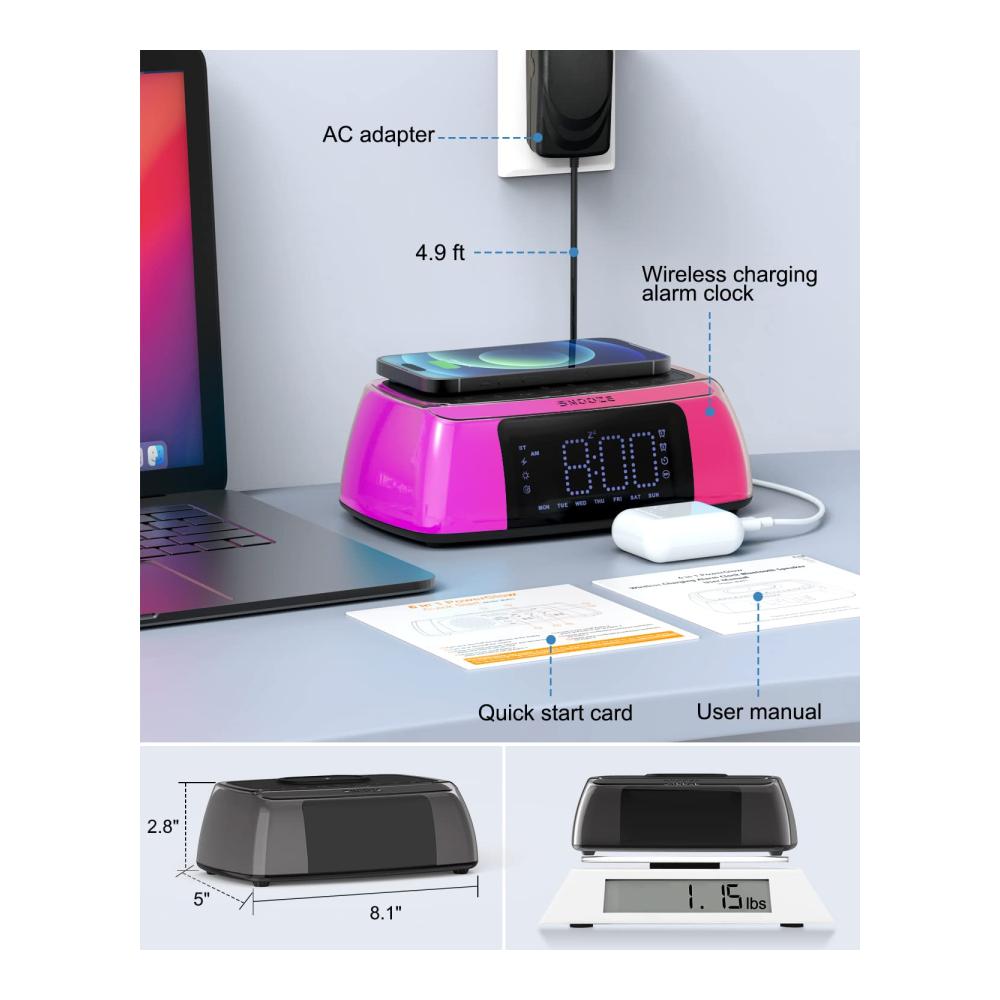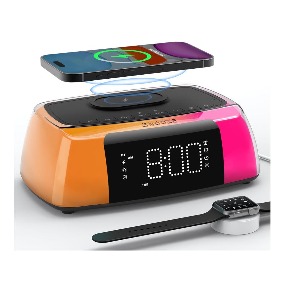 Der kabellose Ladewecker ist eine platzsparende Lösung für Ihren Schreibtisch oder Nachttisch. Es ist der gut lesbare Wecker, Bluetooth-Lautsprecher, Nachtlicht, Geräuschmaschine, Telefonladegerät und Nickerchen-Timer in einem.