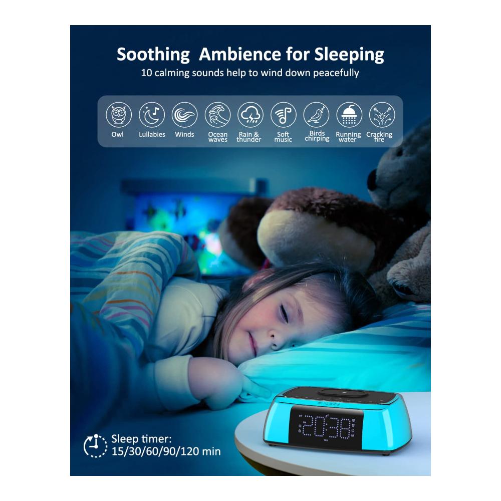Der Wecker verfügt über 7 Alarmtöne und bietet die Möglichkeit, zwei verschiedene Alarme einzustellen. Mit 10 beruhigenden Geräuschen, darunter weißes Rauschen, können Sie sanft einschlafen. Zusätzlich bietet er eine kabellose Ladestation und einen USB-Anschluss für Ihr Smartphone.