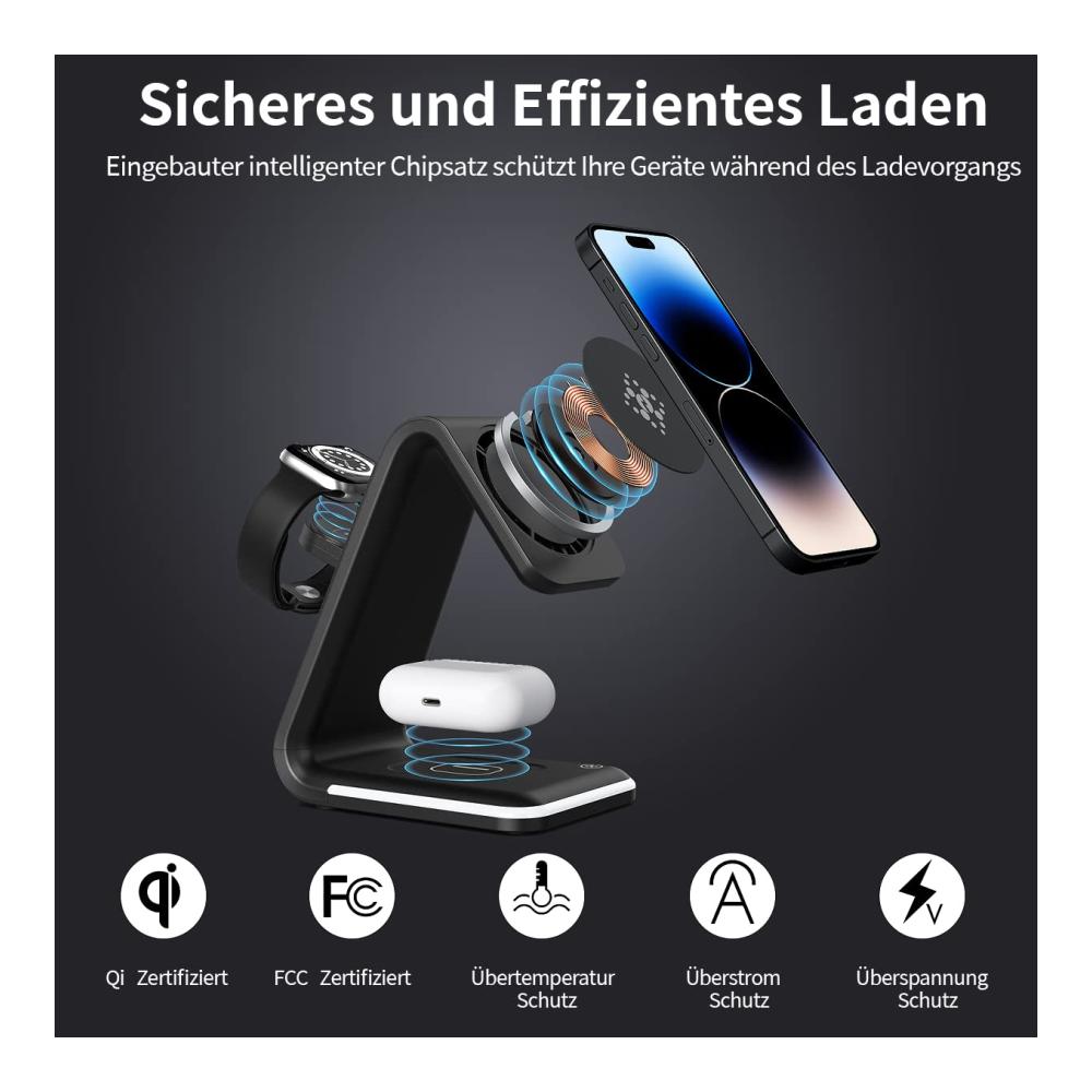 【Mehrfach zertifiziertes sicheres magnetisches kabelloses Ladegerät 3 in 1】Diese kabellose 3-in-1-Ladestation für Apple-Produkte mit mehreren Geräten, hergestellt aus ABS PC und reinem Kupferdraht, robust und dennoch leicht, diese iphone apple watch ladestation bietet Überstrom, Überspannungs, Übertemperatur und Kurzschlussschutz, Fremdstoffprüfung, gültige Identifizierung des Schutzes vor Metallismusstörungen, sorgen für schnelles und sicheres Laden!