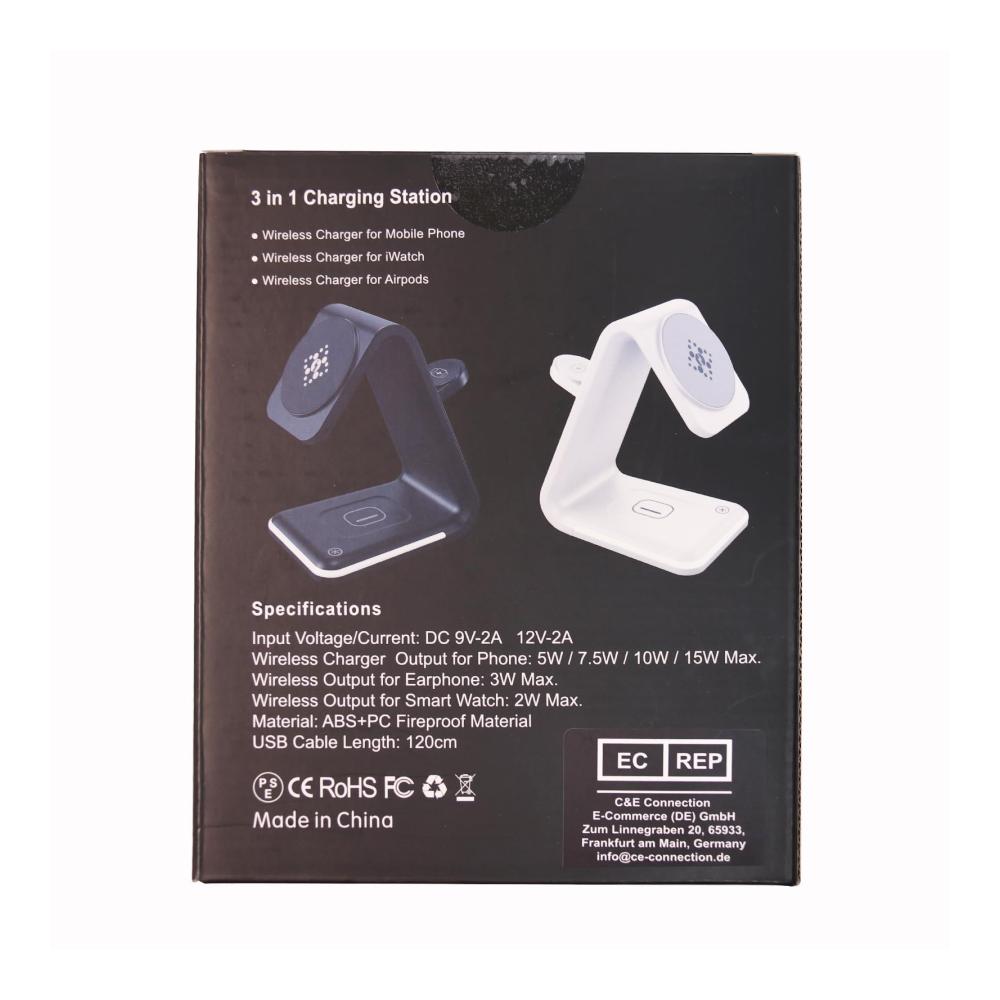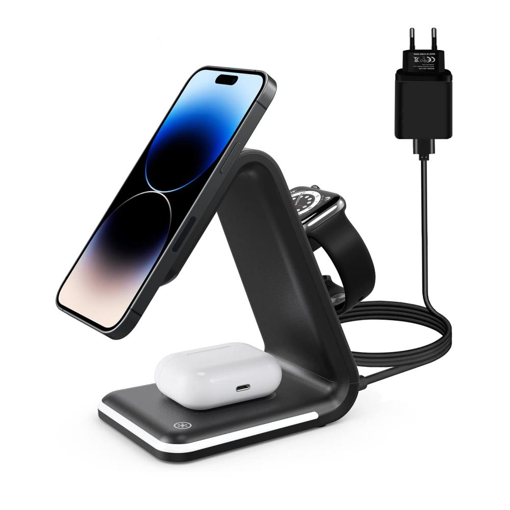 Diese kabellose 3-in-1 Ladestation von HATALKIN ermöglicht das gleichzeitige Aufladen von iPhone, Apple Watch und AirPods. Kompatibel mit iPhone 15/14/13/12, AirPods Pro/Pro 2/3 und Apple Watch Ultra 2/Ultra Serie 9/8/7/6/SE/5/4/3/2. Ausgestattet mit einem 18-Watt-Adapter und CE-zertifiziert für sicheres Laden. Die kompakte Bauweise und das faltbare Design machen sie ideal für unterwegs. Verfügbar in Schwarz.