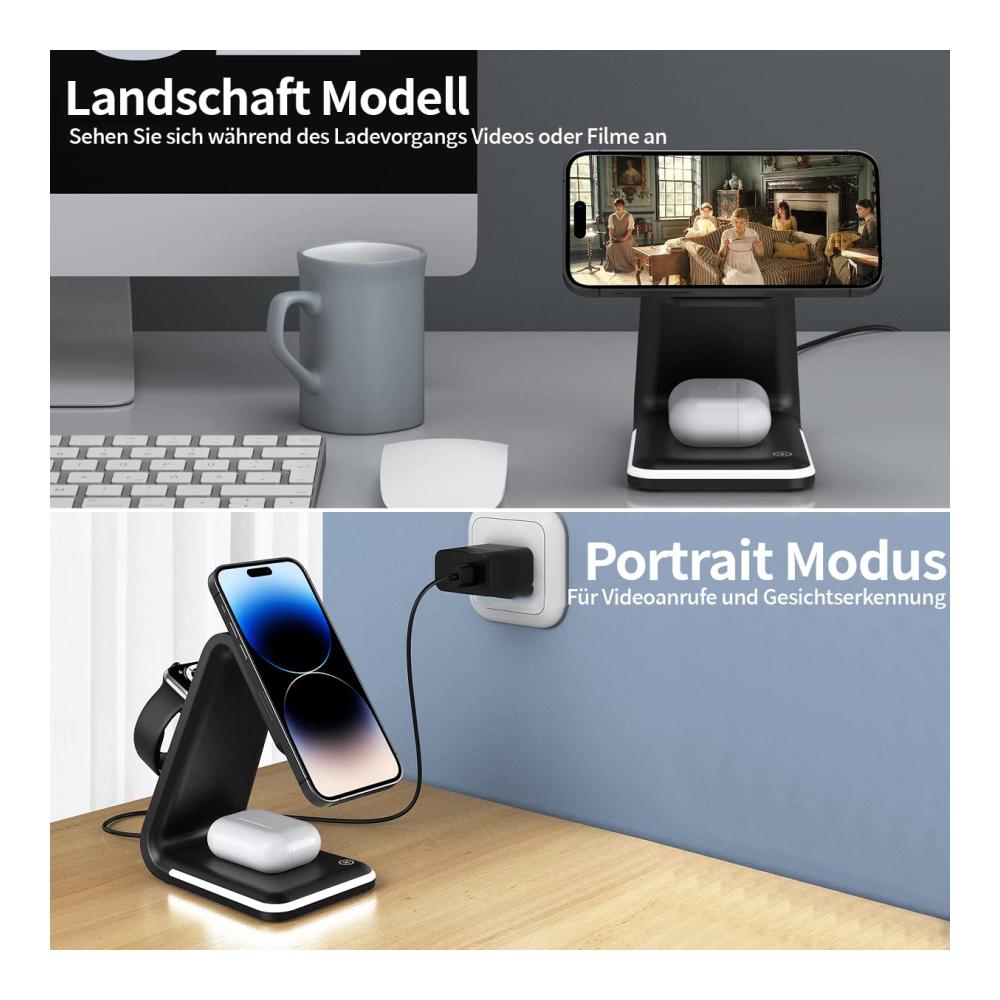 【Mag-safe Ladestation 3in1 Apple Ladegerät】Mit der kabelloses ladegerät iphone können die Geräte gleichzeitig aufgeladen werden. Verabschieden Sie sich vom unordentlichen Desktop und laden Sie Ihr iPhone, Ihre Apple Watch und Ihre AirPods ganz einfach auf. Kompatibel mit iPhone 15/iPhone 14/Phone 13/iPhone 12 Pro/Pro Max/Mini; Apple Watch Ultra 2/Ultra iWatch Series 9/8/7/SE/6/5/4/3/2; AirPods 3/2 Airpods Pro/Pro2[NUR Mit Mag-safe kabellosem Ladecase].Hinweis: Nicht für andere smartwatches.