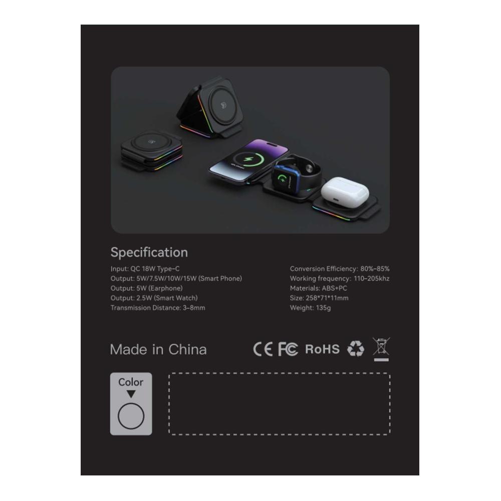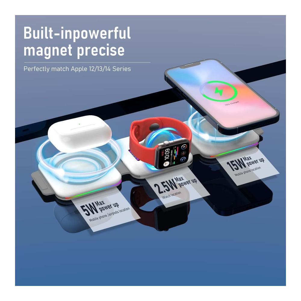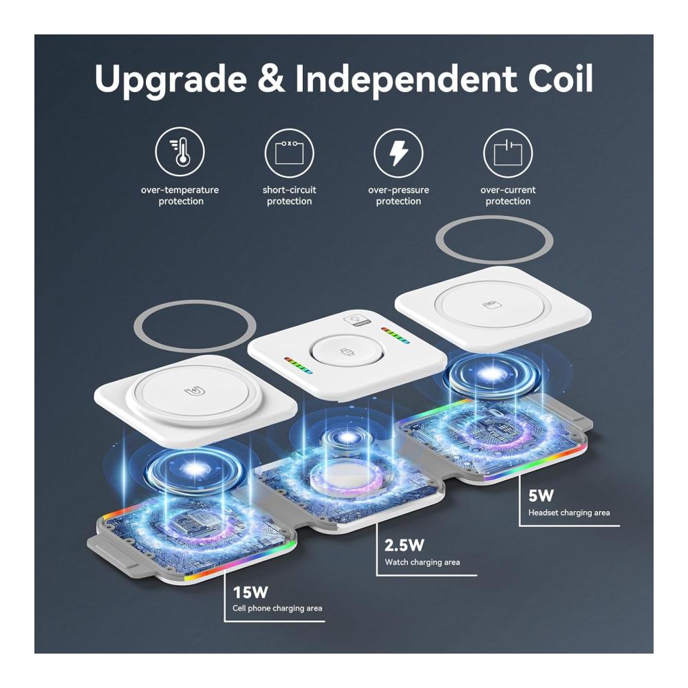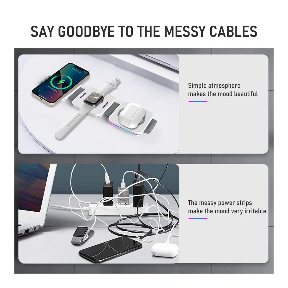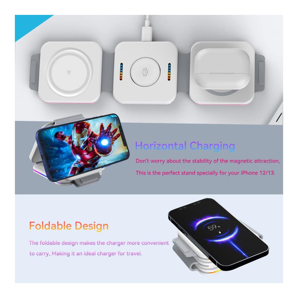 Ungewöhnliche LadespuleVerbesserte Spule kann helfen, die Ladeeffizienz um 35% zu erhöhen, spezielle magnetische Isolationsfolie, keine Angst vor Strahlung. Und Wireless Charging Station ist mit Fremdkörpererkennung, Kurzschlussschutz, Temperaturkontrolle und mehr ausgestattet | Faltbar in ein LadepadNach dem 360°-Falten wird dieses kabellose 3-in-1 Handy Ladegerät zu einem Ladeboard, das Ihre Anforderungen an Minimalismus erfüllt. Nach dem Kauf dieses kabellosen Ladegeräts sind Sie gleichbedeutend mit drei Arten von Ladegeräten und Handyhaltern. | Platzieren für HorizontalDie Leute mögen seine dreidimensionale Form, die ihnen hilft, die Langeweile beim Warten auf das Aufladen zu vertreiben, und es sieht toll aus. Machen Sie sich keine Sorgen um die Stabilität der magnetischen Anziehungskraft, dies ist der perfekte Ständer, der speziell auf Ihr iPhone 15/14/13/12 zugeschnitten ist. |