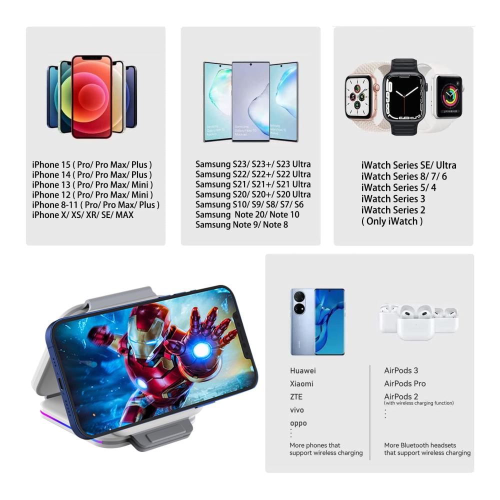 3 in 1 Wireless Charger: Die Schnelle 3-in-1 Ladestation ist äquivalent zu einer Ladestation Für iWatch, einer Handy Ladestation und einer Ladestation Für Air Pods. Kompatibel mit iPhone 15/15 Plus/15 Pro/15 Pro max/14/14 Plus/14 Pro/14 Pro Max/13/13 Pro/13 Pro Max/13 mini/12/12 Pro/12 Pro Max/12 mini/11/11 Pro/11 Pro Max/XR/XS/XS MAX/X/8/8Plus & iWatch Ultra/9/8/7/SE/6/5/4/3/2 & Air Pods Pro/3/2.