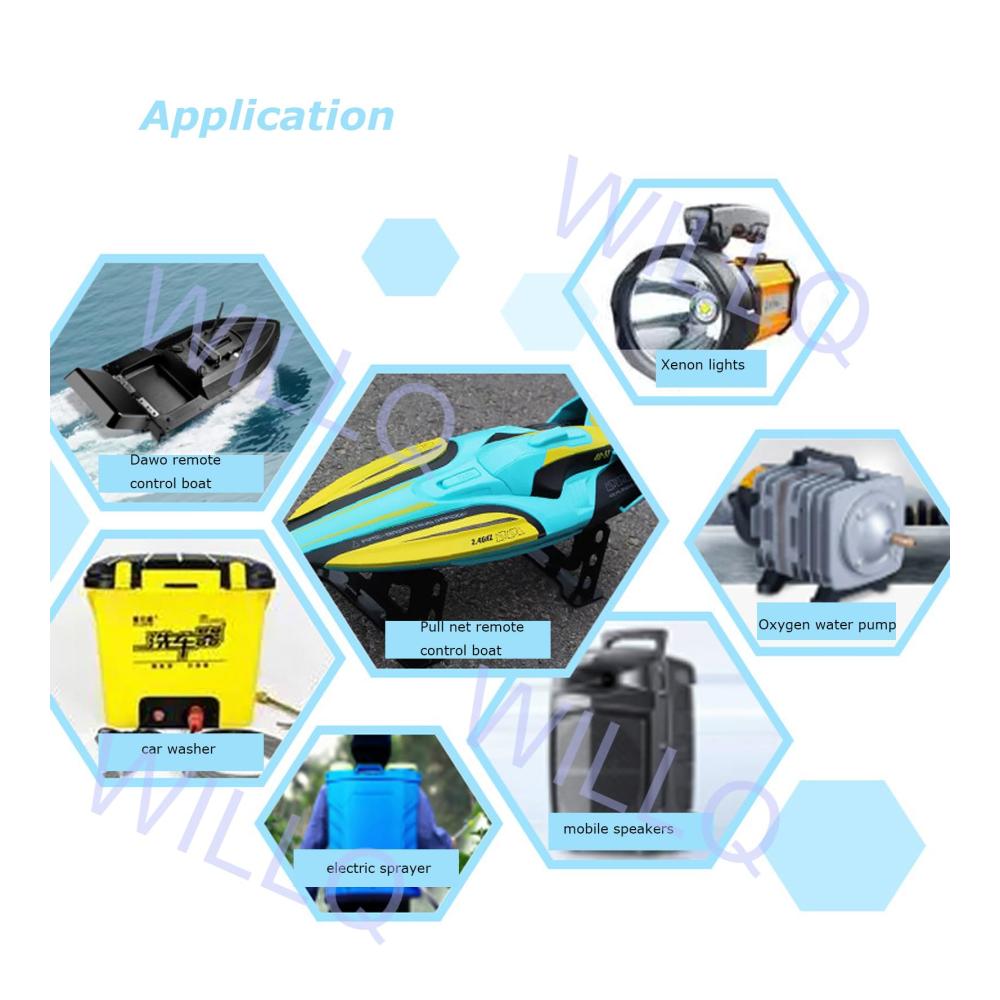 [Anwendungen] Es kann in verschiedenen Bereichen mit 12-V-Stromversorgung verwendet werden: ferngesteuertes Nestboot, ferngesteuertes Zugnetzboot, Xenonlampe, Sauerstoffpumpe, elektrisches Sprühgerät usw.