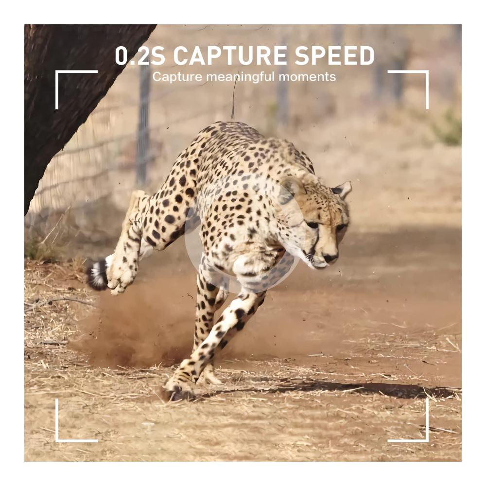Die Auslösereaktionszeit der wildtierkamera beträgt 0.2s, was bedeutet, dass die Kamera in 0.2s reagiert und Bilder oder Videos aufnimmt, sobald ein Tier erscheint.
