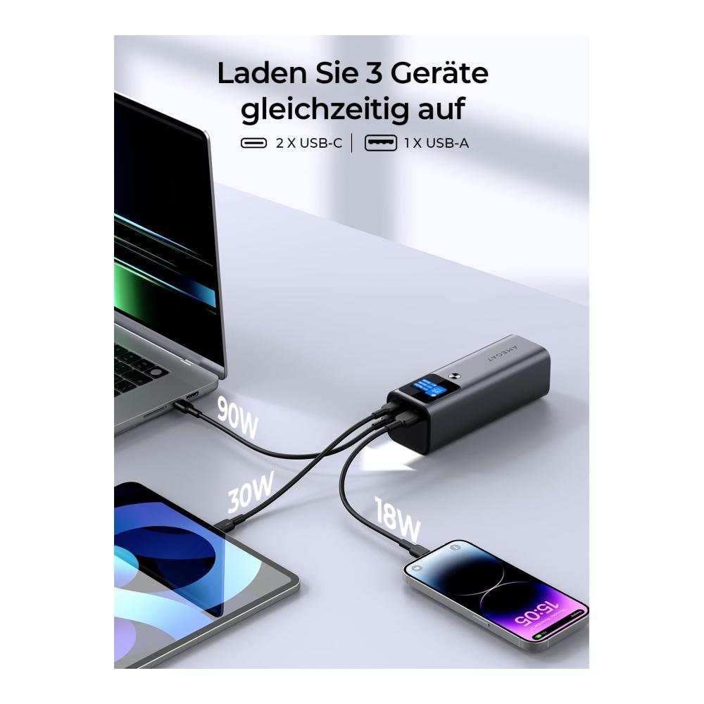 Laden Sie 3 Geräte gleichzeitig auf: Ausgestattet mit USB-A- und 2 USB-C-Anschlüssen können Sie mit dem tragbaren Ladegerät Ihren Laptop, Ihr Telefon und Ihr Tablet gleichzeitig aufladen. Dank der dynamischen Stromverteilungsfunktion werden alle Geräte mit optimaler Geschwindigkeit geladen, ohne dass es zu Verzögerungen kommt.