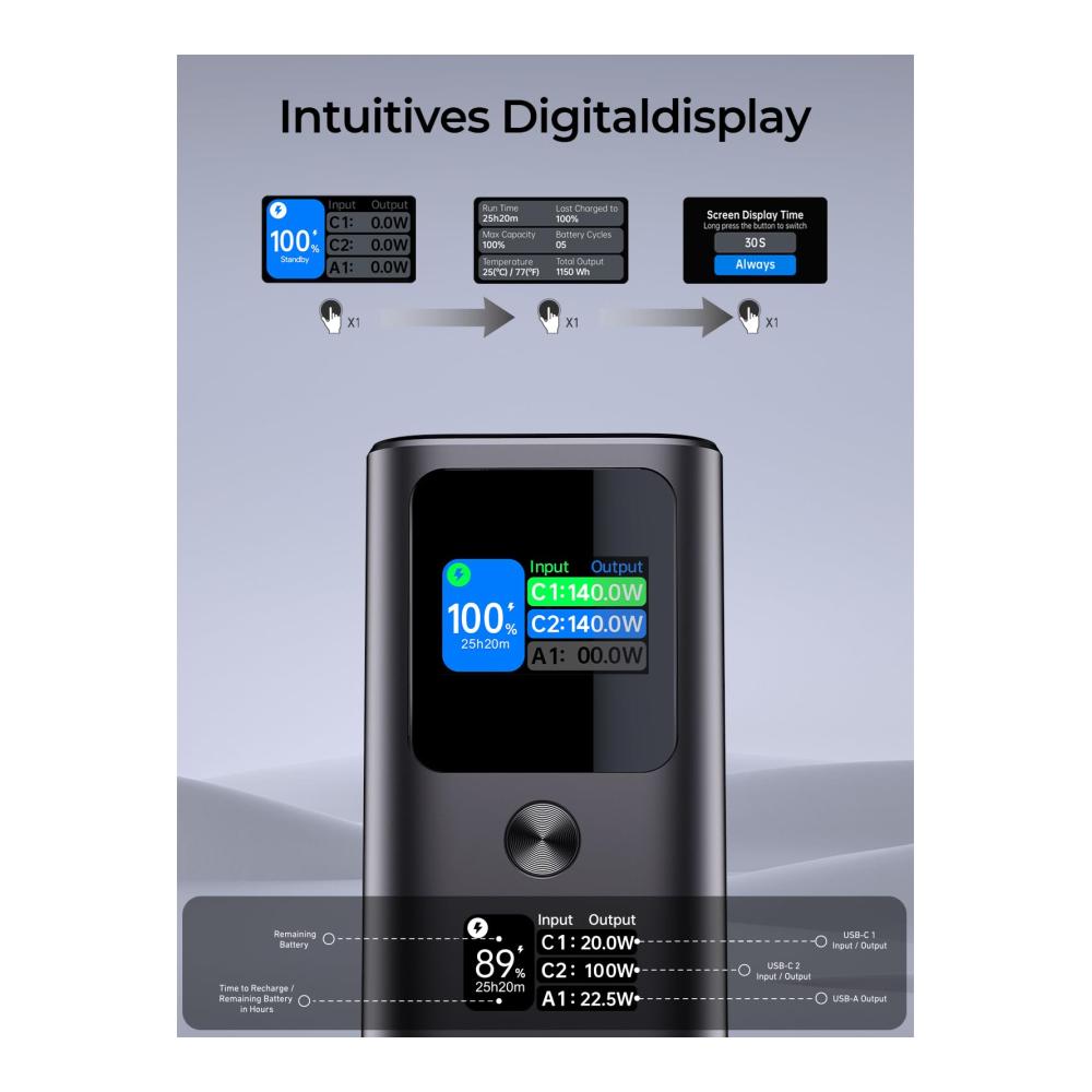 Intuitives, intelligentes Digitaldisplay: Behalten Sie den Status Ihrer Powerbank mühelos im Blick mit dem gut lesbaren LCD-Digitaldisplay. Es zeigt die Ausgangs- und Eingangsleistung sowie die geschätzte Zeit für eine vollständige Aufladung an.