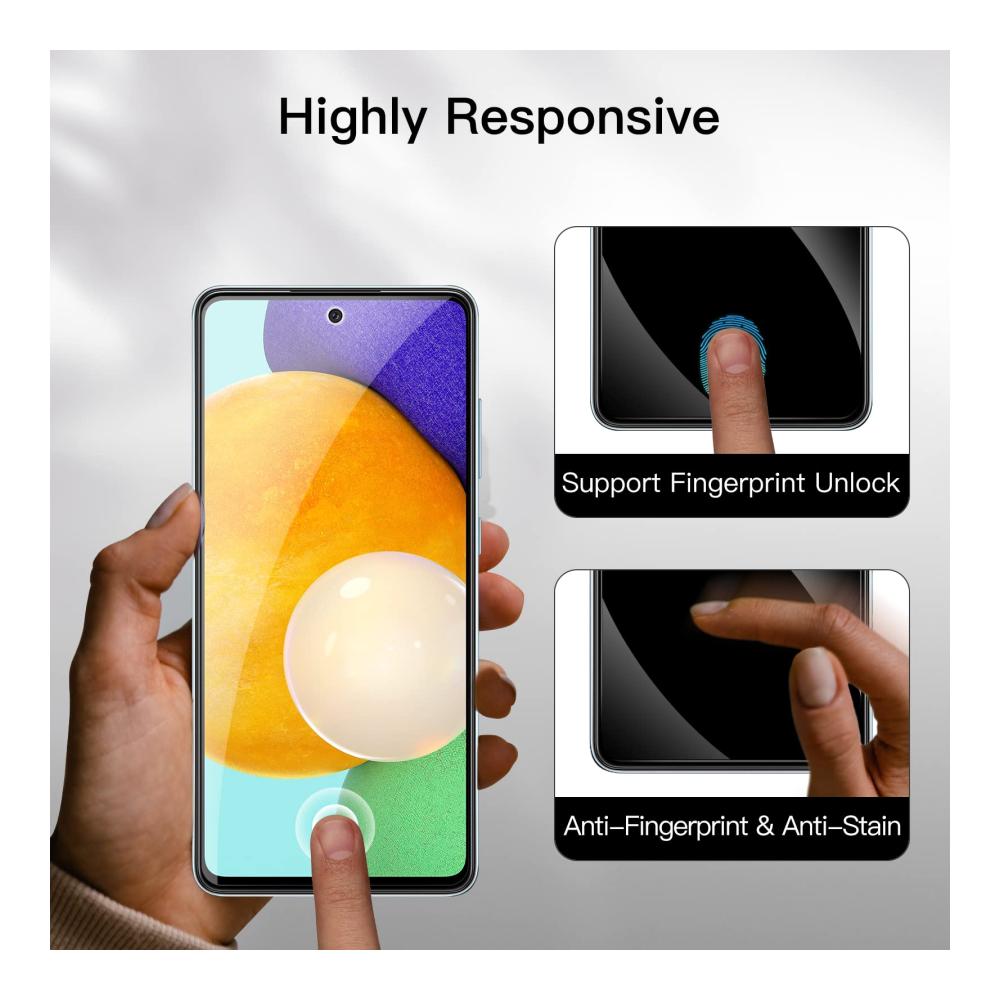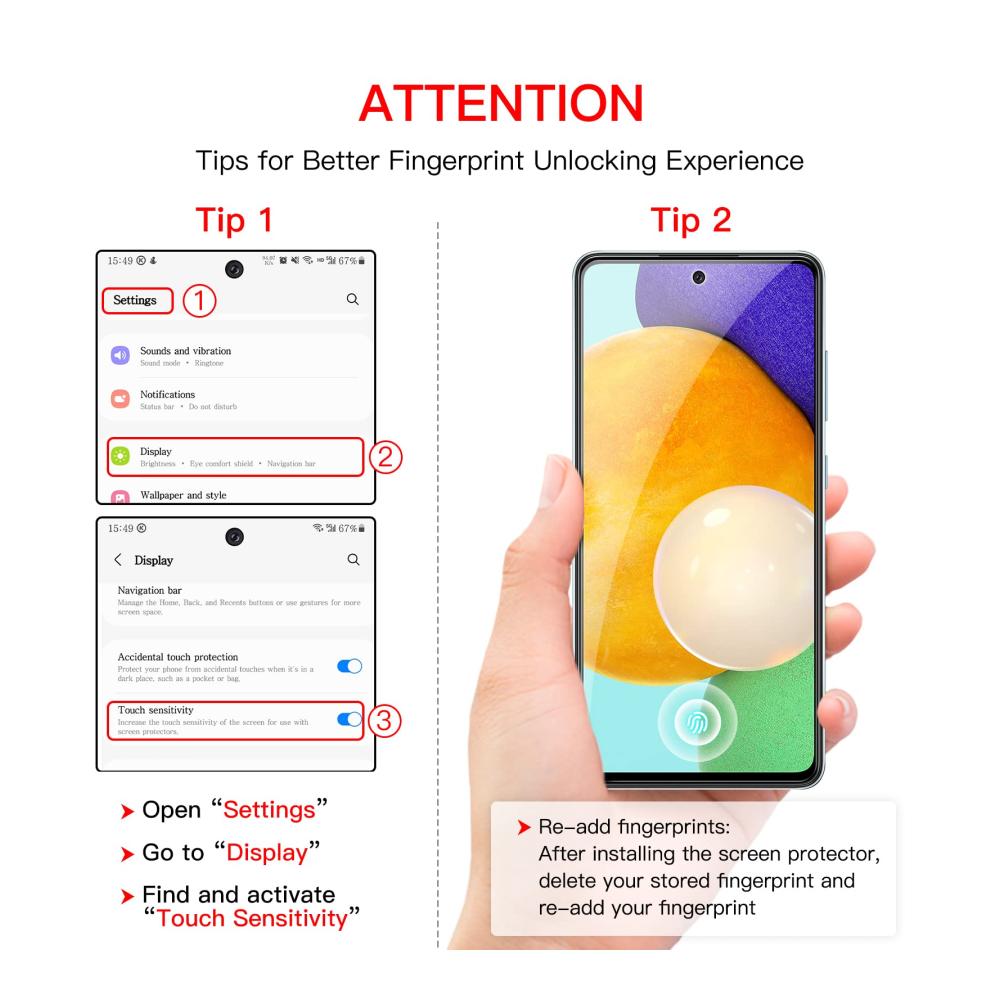 [Fingerabdruck Entsperrt] Entwickelt für Samsung Galaxy A52 / A52 5G / A52s 5G 6.5-Zoll. Für ein besseres Entsperrerlebnis gehen Sie bitte zu den Einstellungen Ihres Geräts, um die Berührungsempfindlichkeit zu aktivieren, und geben Sie nach dem Anbringen der Folie Ihren Fingerabdruck erneut ein