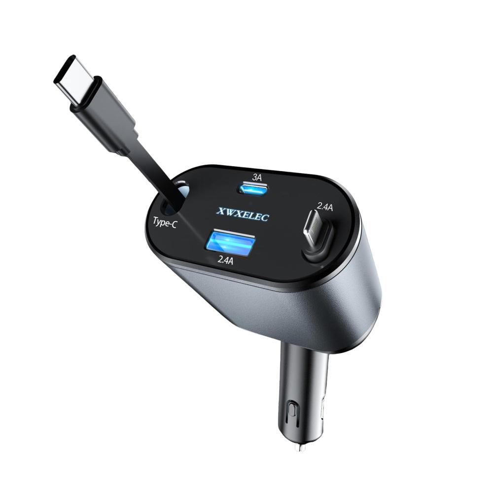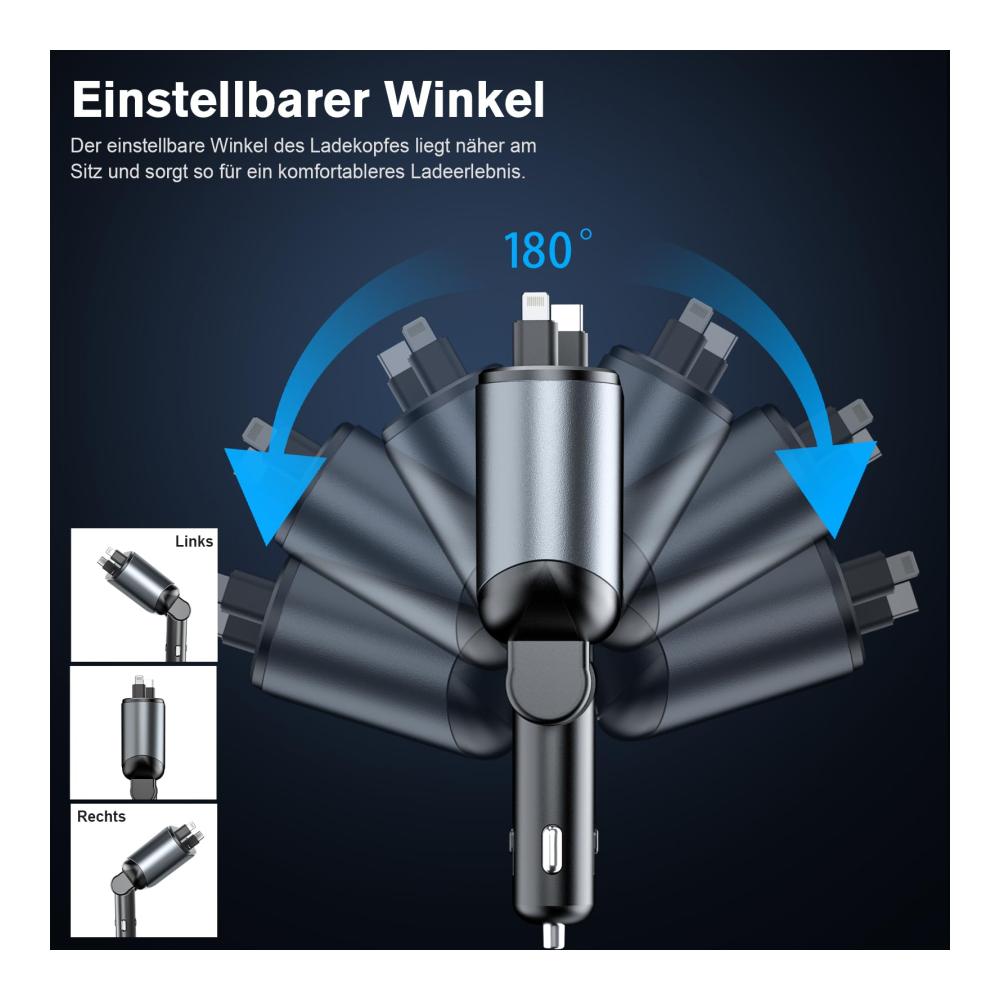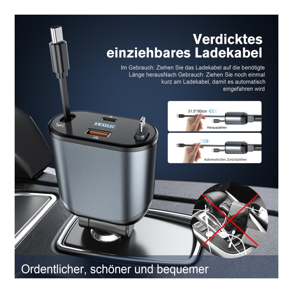 ⚡【Einziehbares Autoladegerät】 Das einziehbare Kabel kann nach Gebrauch zur einfachen Aufbewahrung automatisch eingezogen werden. Ziehen Sie es einfach zweimal oder bis zum Ende, und das Kabel wird wieder eingezogen. Verabschieden Sie sich von den unordentlichen Kabeln in der Autokonsole.