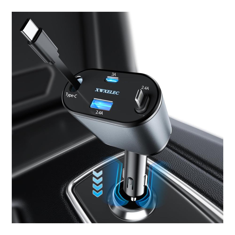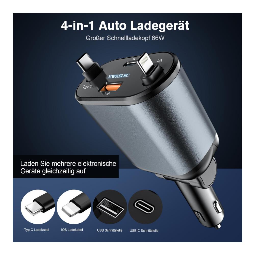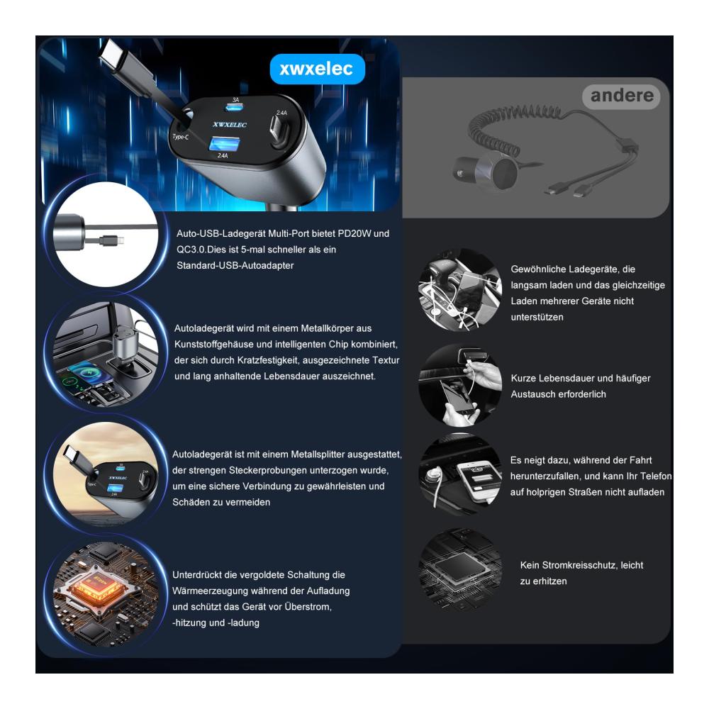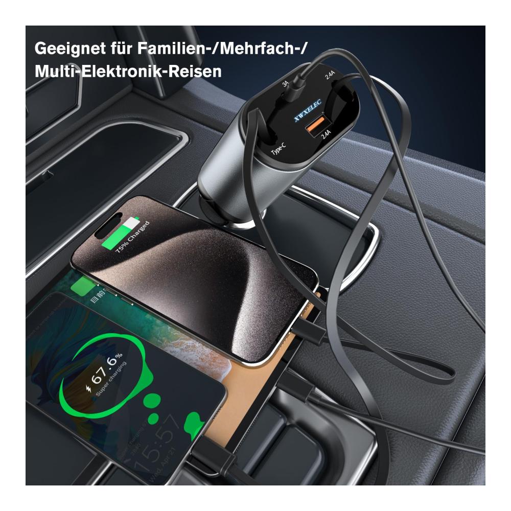 ⚡【Auto Schnellladegerät USB】 Schnellladung mit vier Anschlüssen, handy schnellladegerät auto,einziehbares Kabel bietet Typ-C-Ladegeschwindigkeit von bis zu 78W und PD12W-Aufladung, einschließlich USB- und Typ-C-Anschlüsse(20W Schnellladung)Zigarettenanzünderadapter für Auto-USB-Ladegerät Multi-Port bietet PD20W und QC3.0.Dies ist 5-mal schneller als ein Standard-USB-Autoadapter. Kann iPhone 15 aufladen.Es ist für alle USB-Geräte geeignet,um Super-Ladeanforderungen zu erfüllen.