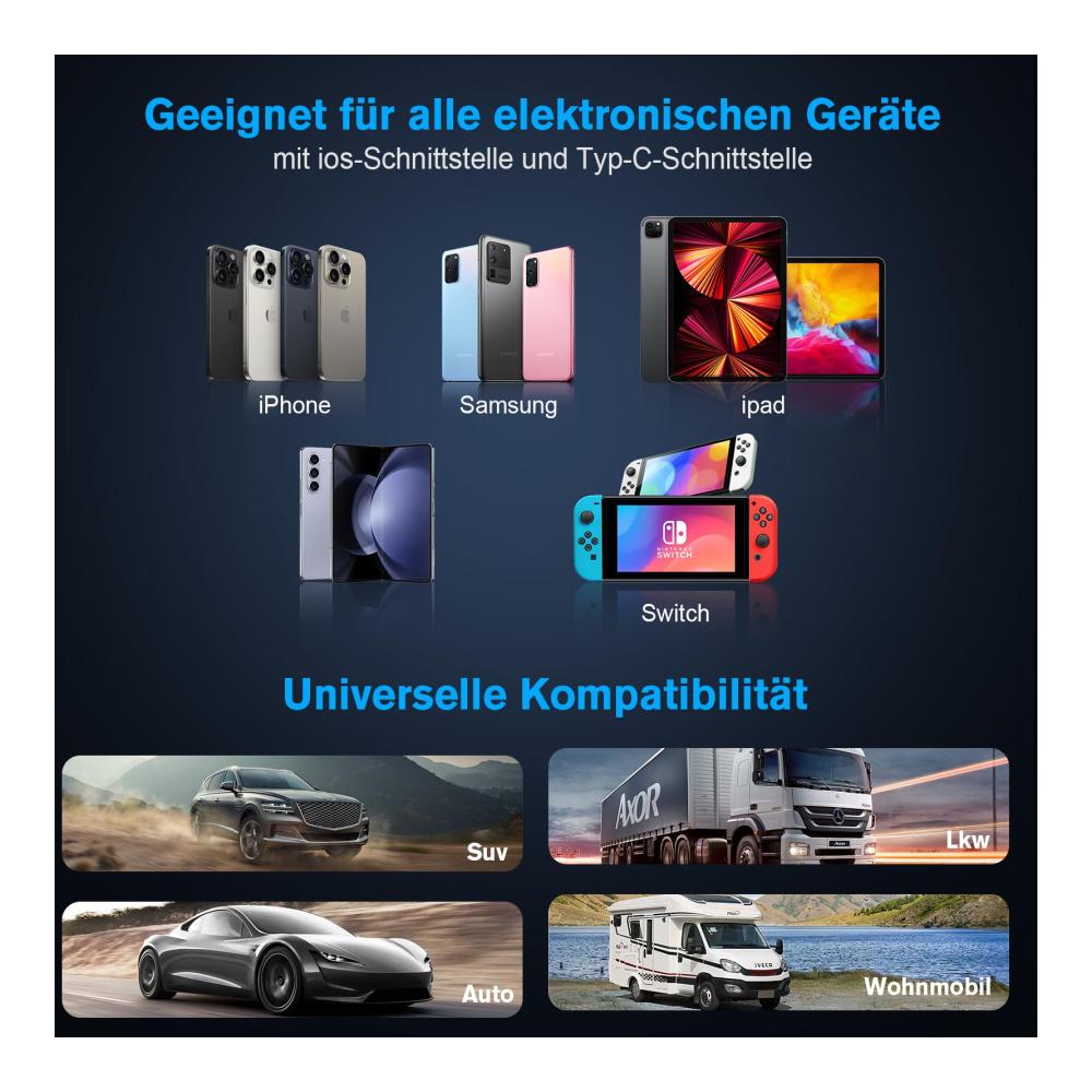 Praktische Lieferumfang: Im Lieferumfang enthalten ist das einziehbare Auto Ladegerät, das Ihnen eine bequeme Lademöglichkeit für unterwegs bietet.