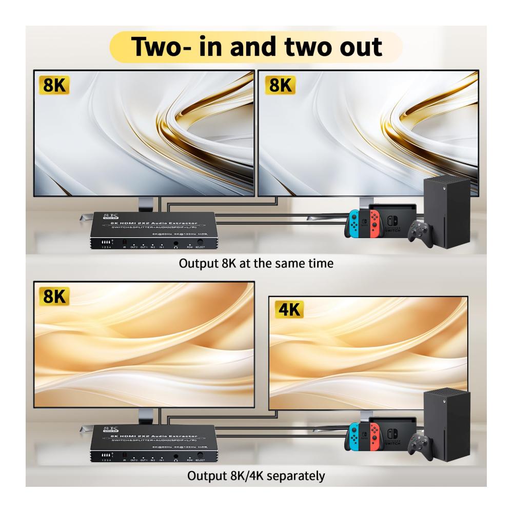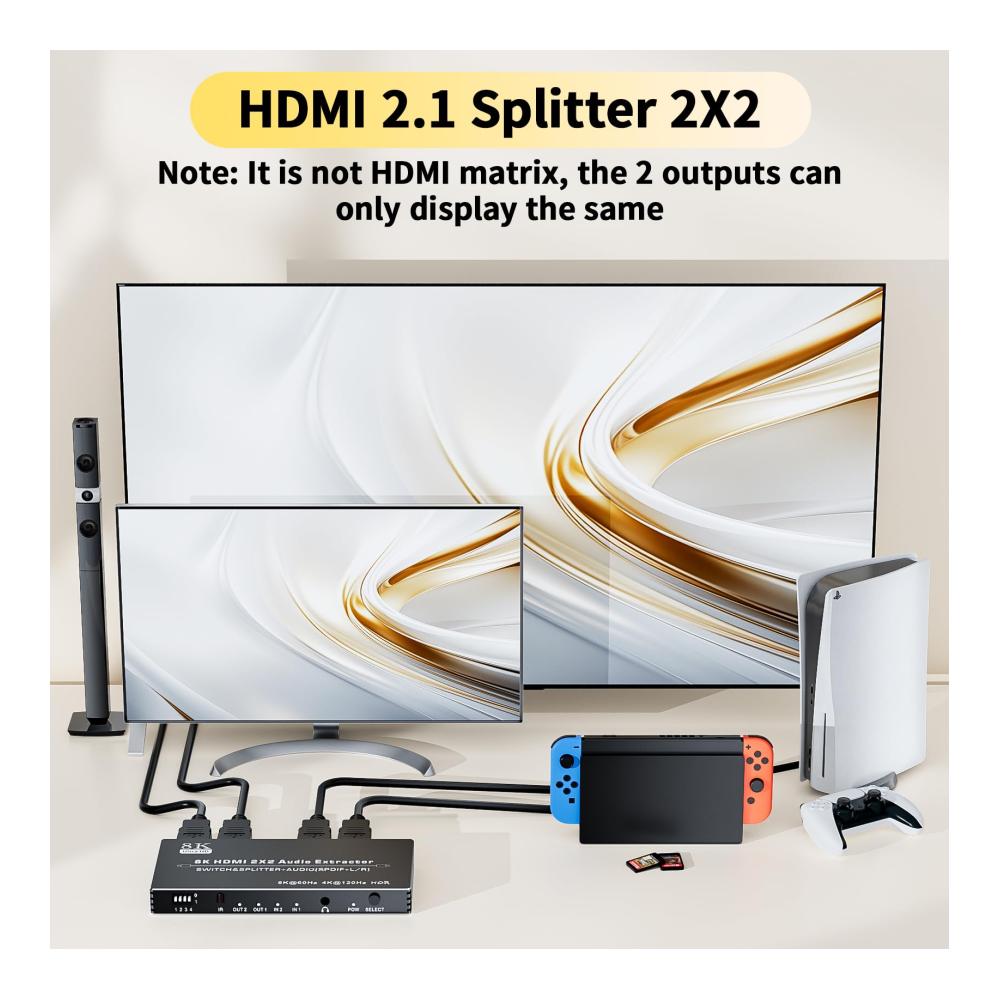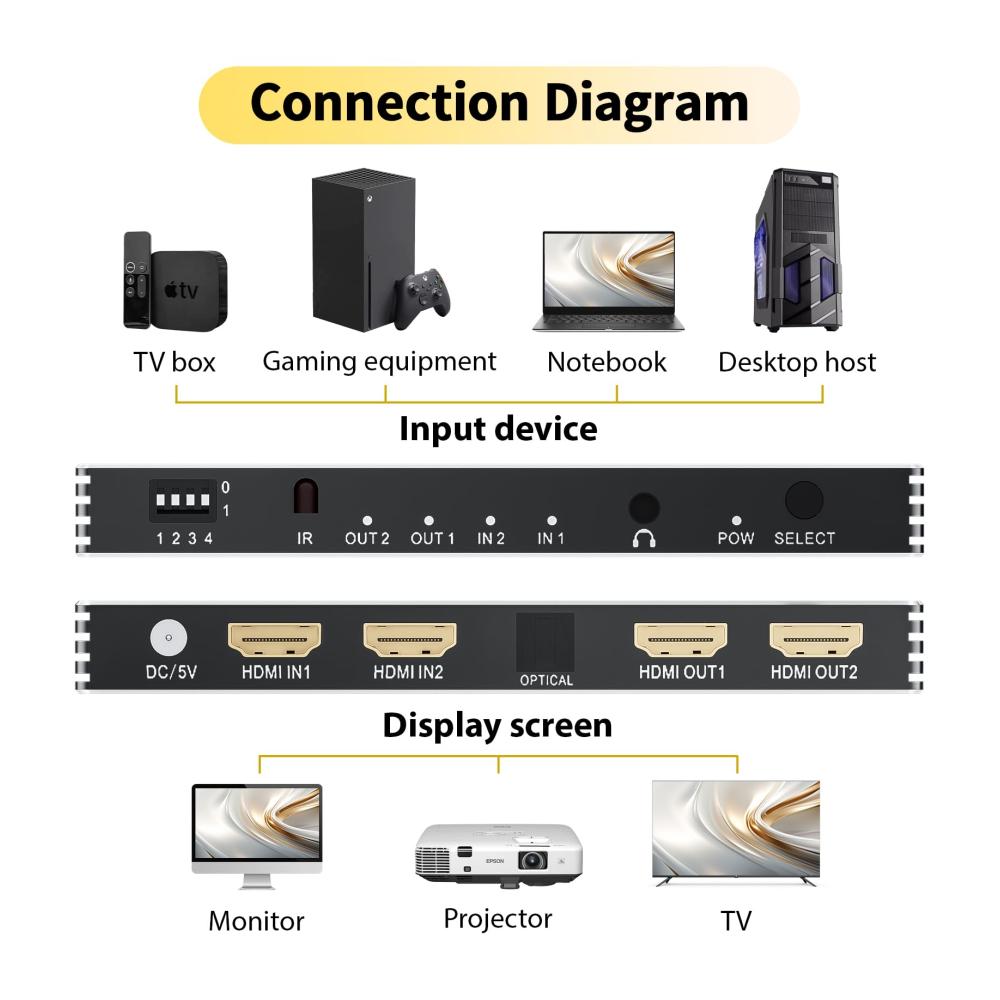 【2 in 2 Out HDMI-Switch-Splitter mit Audioextraktor】 Der Bolaazul-Dual-Funktion 2×2 HDMI 2.1-Splitter und Switcher verfügen über zwei HDMI-Eingänge und zwei HDMI 2 Ausgangsanzeigen. Audioextraktion: Funktioniert Audioextraktion über optische Ports.