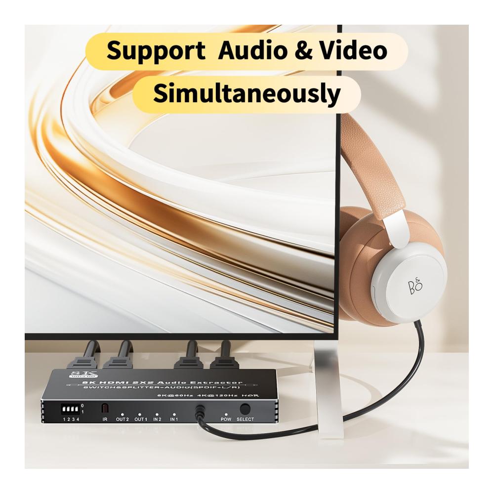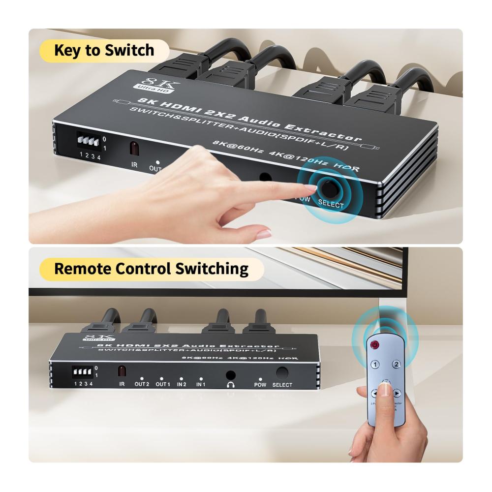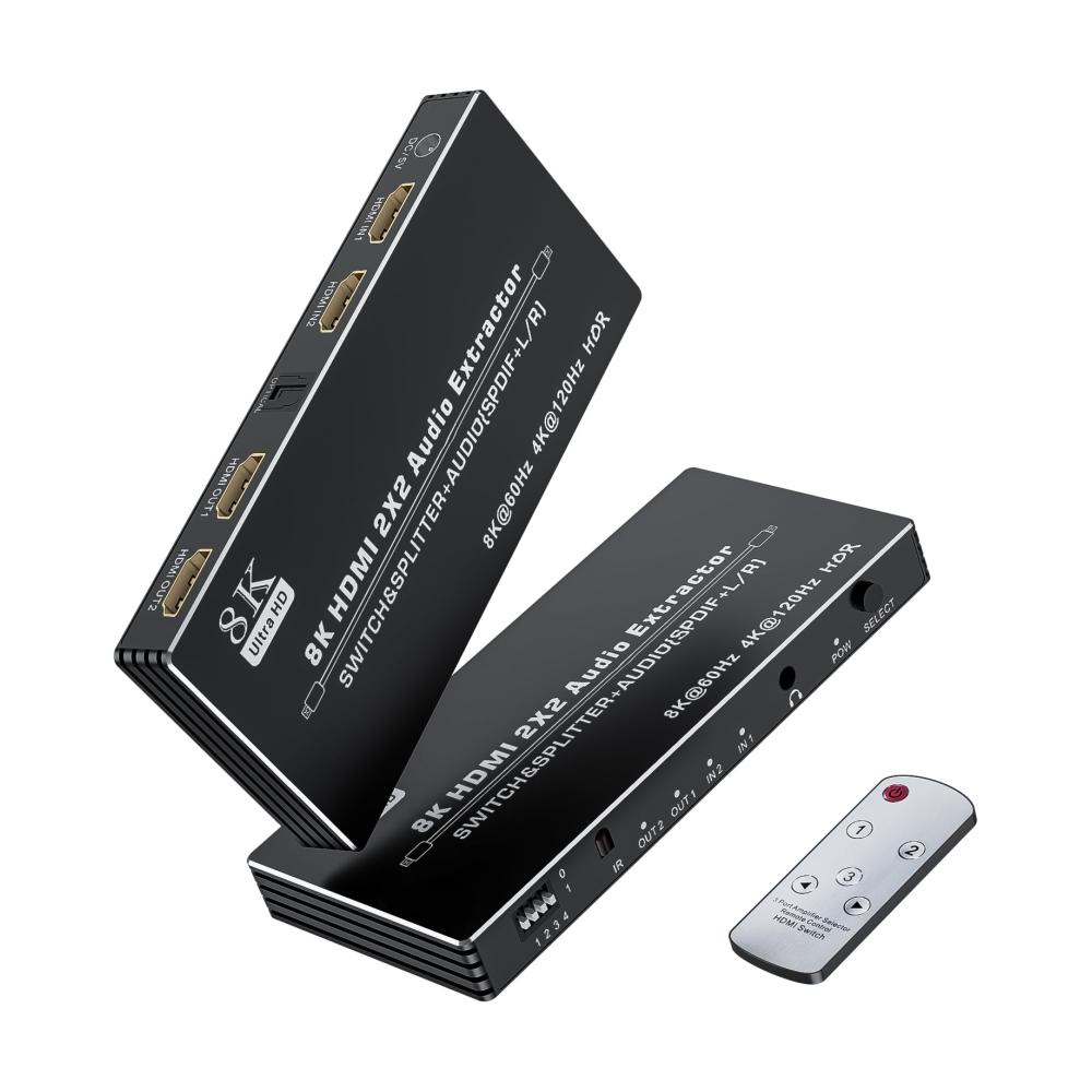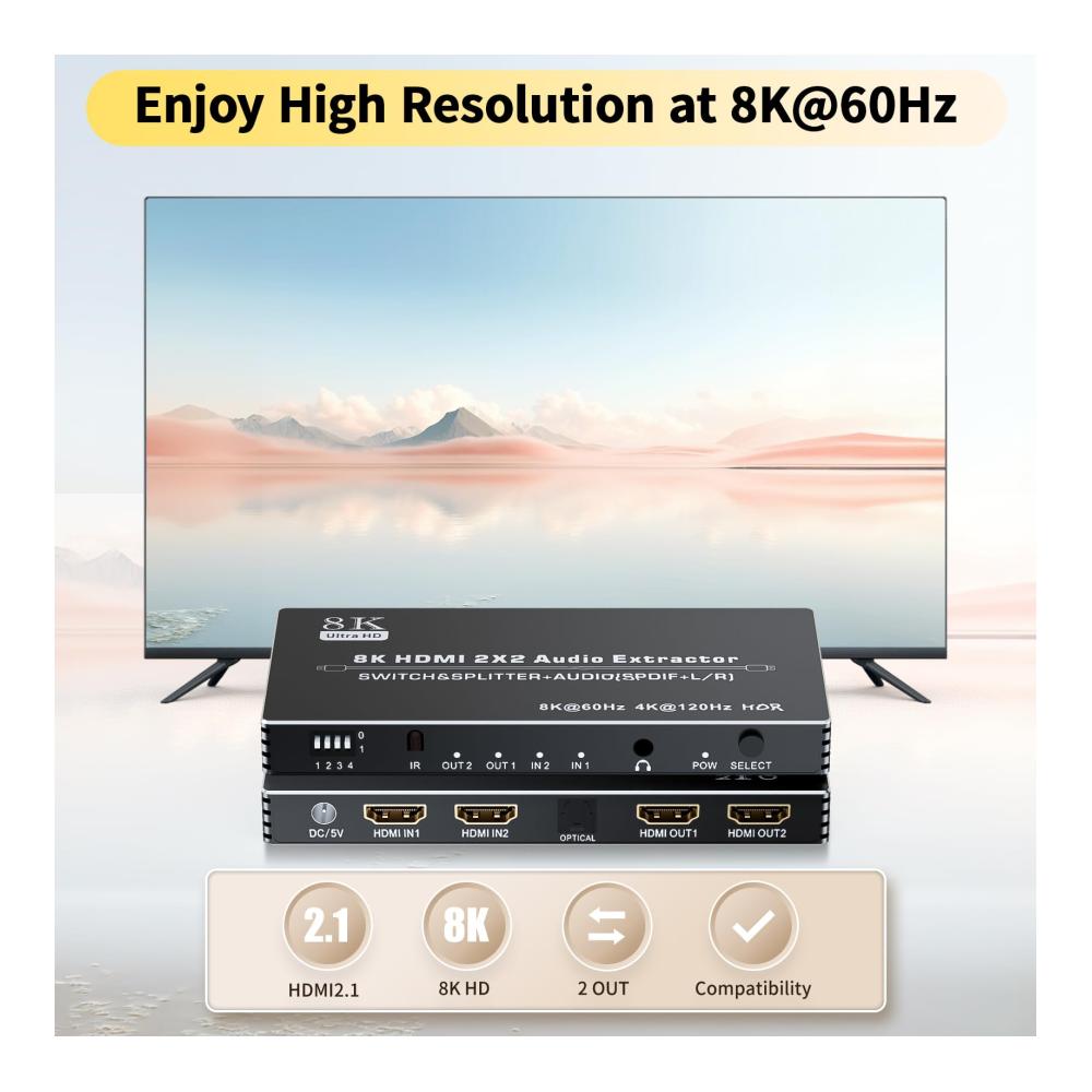 【2 in 2 Out HDMI-Switch-Splitter mit Audioextraktor】 Der Bolaazul-Dual-Funktion 2×2 HDMI 2.1-Splitter und Switcher verfügen über zwei HDMI-Eingänge und zwei HDMI 2 Ausgangsanzeigen. Audioextraktion: Funktioniert Audioextraktion über optische Ports.