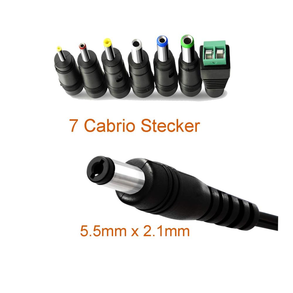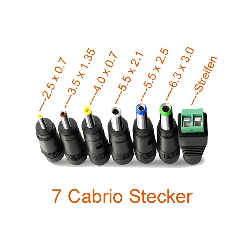 7 Cabrio Stecker: 5.5mm x 2.1mm / 5.5mm x 2.5mm / 3.5mm x 1.35mm / 4.0mm x 1.7mm / 2.5mm x 0.7mm / 6.3mm x 3.0mm / LED