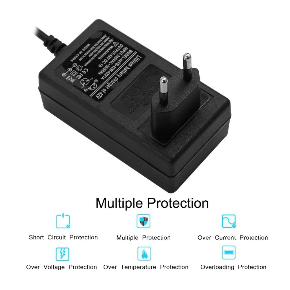 Das 42V1A Netzteil Ladegerät Adapter für Smart Balance Car Scooter ist ein unverzichtbares Zubehör für Ihre Reisen. Mit seiner breiten Spannungskompatibilität von 110–240 V und dem EU-Stecker ist es ein internationaler Netzadapter für verschiedene Regionen. Die LED-Anzeige ermöglicht es Ihnen, die Ladesituation klar zu erkennen. Zusätzlich bietet das Ladegerät mehrfachen Schutz, darunter Überladeschutz, Kurzschlussschutz, Überstromschutz und Überhitzungsschutz, für eine sichere Verwendung. Seine vielseitige Kompatibilität macht es perfekt für Scheinwerfer, Spielzeugautos, Balance-Autos und mehr.