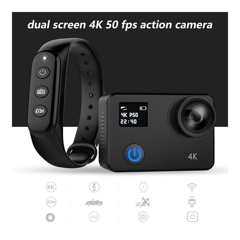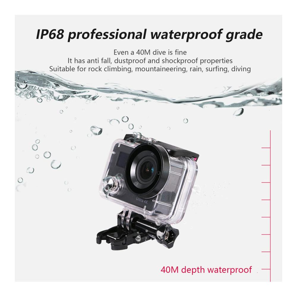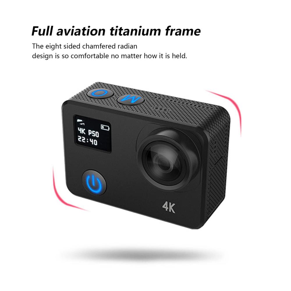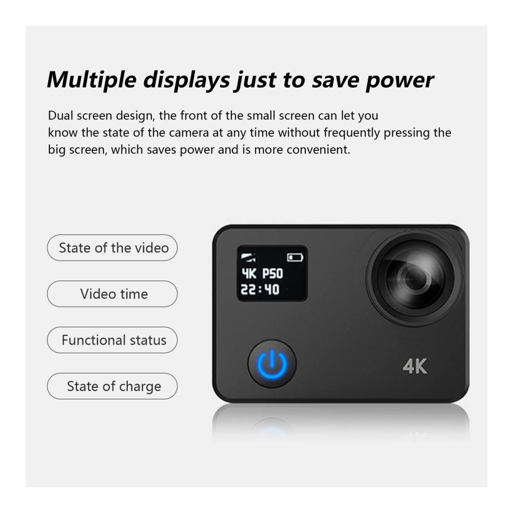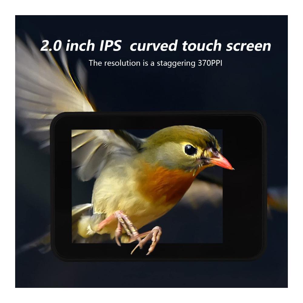 • Dualer Bildschirm und 2-Zoll-Touchscreen: Die Action-Kamera verfügt über ein Dual-Screen-Design. Auf dem kleinen vorderen Bildschirm können Sie jederzeit den Status der Kamera erkennen, ohne häufig auf das Licht des großen Bildschirms drücken zu müssen. Dies spart Strom und ist bequemer. Der 2-Zoll-IPS-Touchscreen unterstützt die Vollwinkelbetrachtung.