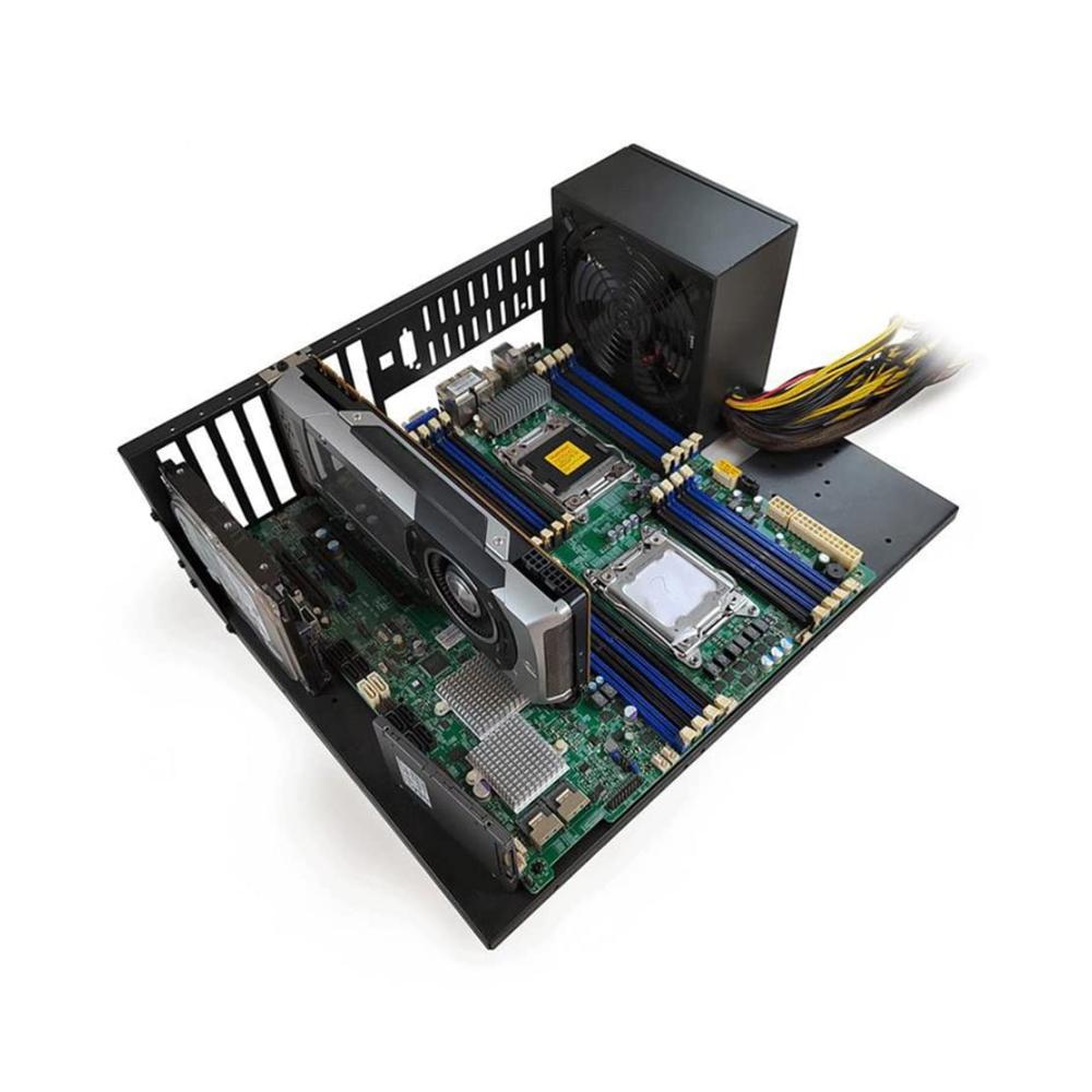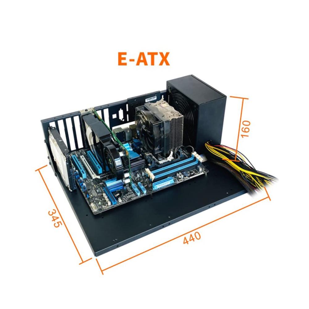 Aus hochwertigem Stahl gefertigt und in Schwarz gehalten, bietet dieses Gehäuse maximale Stabilität und Langlebigkeit. Die kompakte Größe von 440x345x160mm (nach Installation des Netzteils) macht es ideal für jeden Mining-Einsatz.