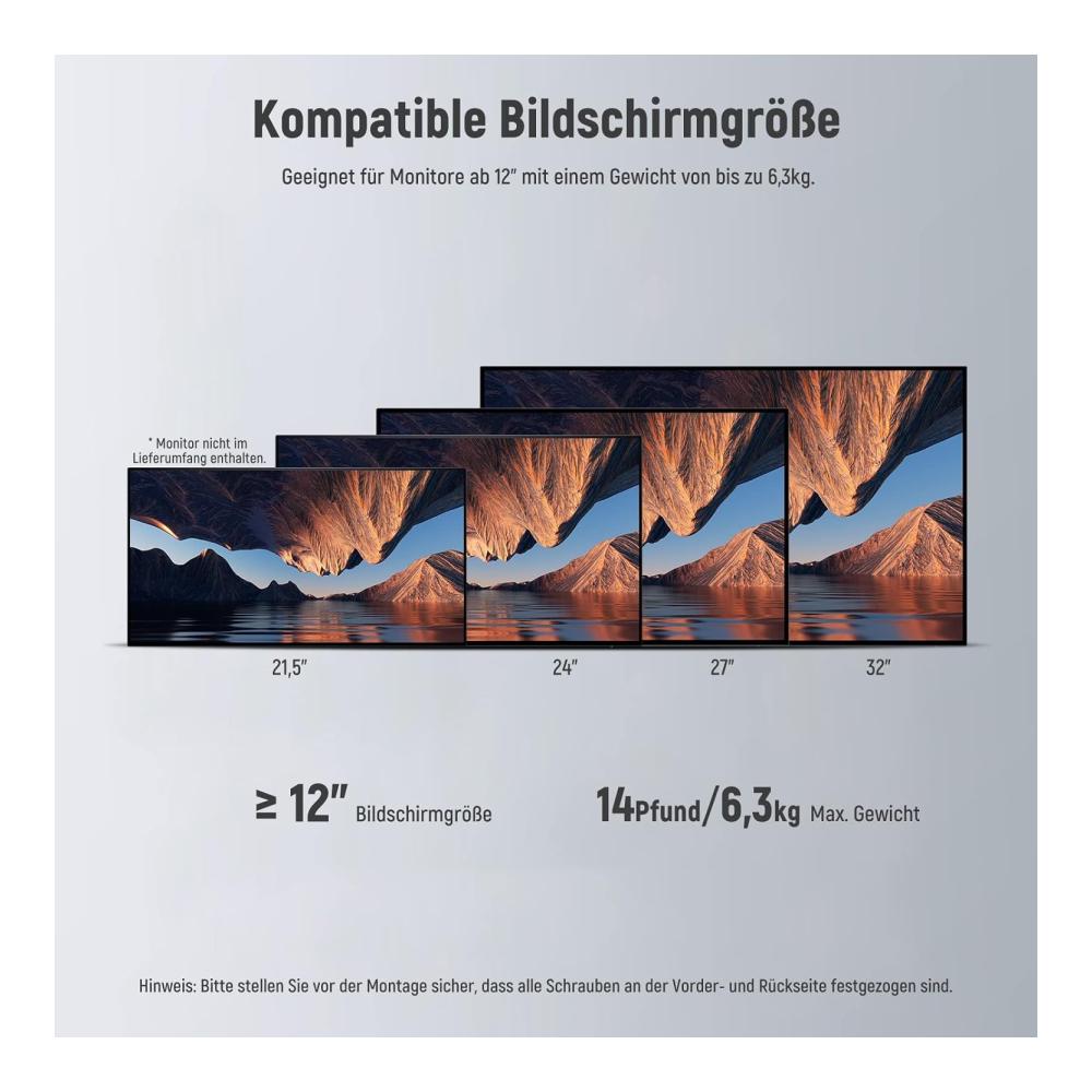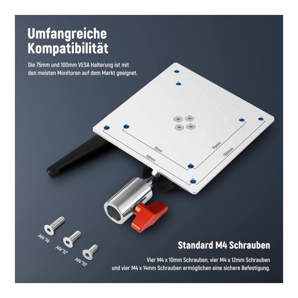 【Kompatibilität mit Standard M4 Schrauben und VESA Platten】 Jeder Montageadapter enthält vier M4 x 10mm Schrauben, vier M4 x 12mm Schrauben und vier M4 x 14mm Schrauben für eine sichere und ordnungsgemäße Befestigung. Die 75mm und 100mm VESA Halterung ist mit den meisten Monitoren auf dem Markt kompatibel
