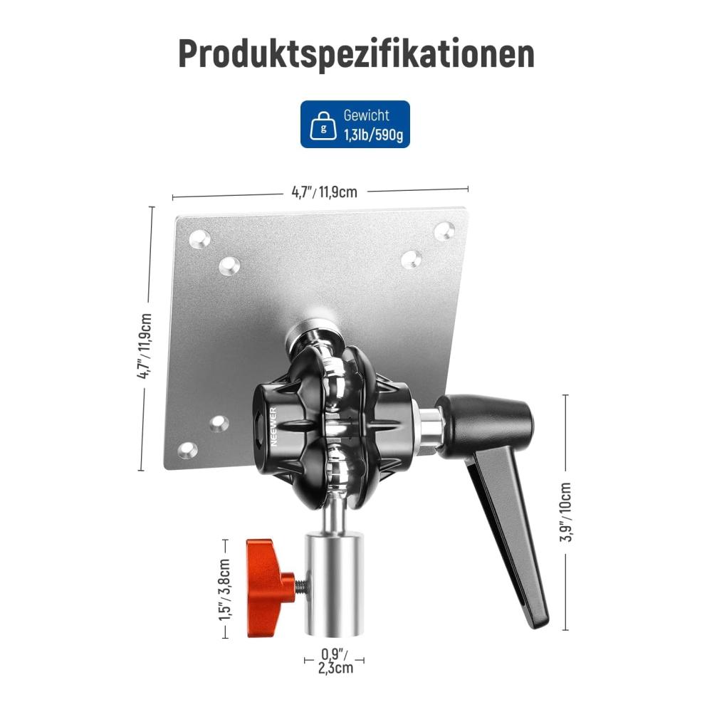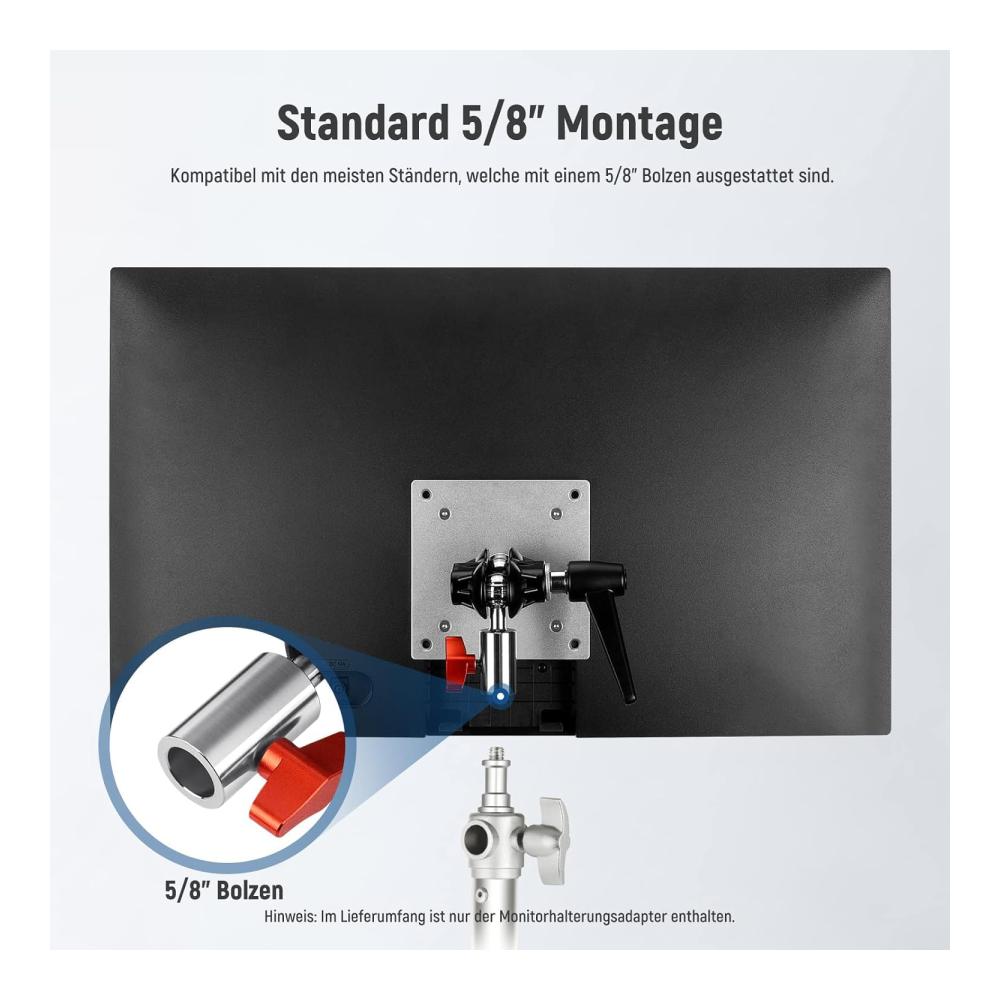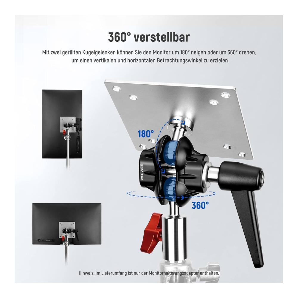 Entdecken Sie unser hochwertiges Produkt, den Monitor Mount Adapter mit VESA Halterung. Hergestellt aus Aluminium bietet er solide Unterstützung für Bildschirme mit einer Maximalbelastung von 6,3kg. Dank der beiden 360° Kugelgelenke können Sie Ihren Bildschirm flexibel positionieren. Mit den mitgelieferten M4 Schrauben und dem 5/8 Empfänger ist eine sichere Befestigung gewährleistet. Perfekt für Besprechungen, Präsentationen und mehr!
