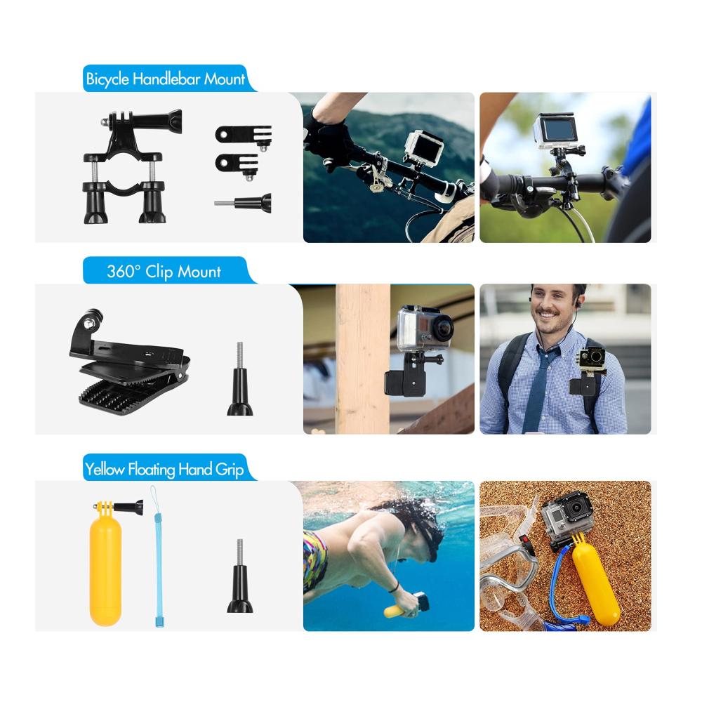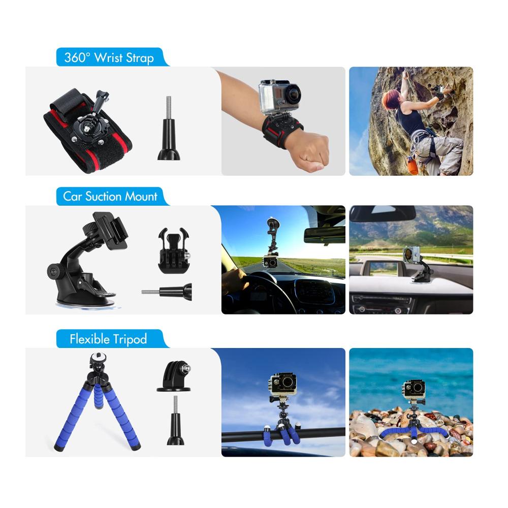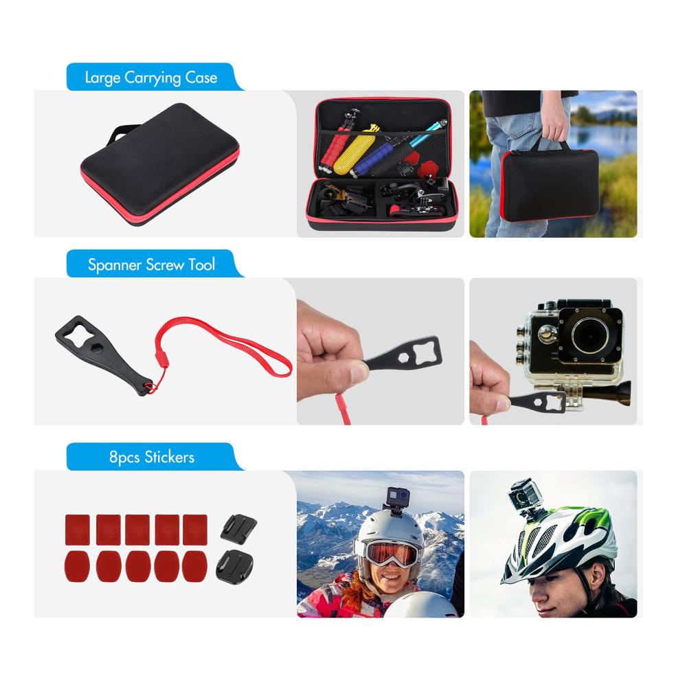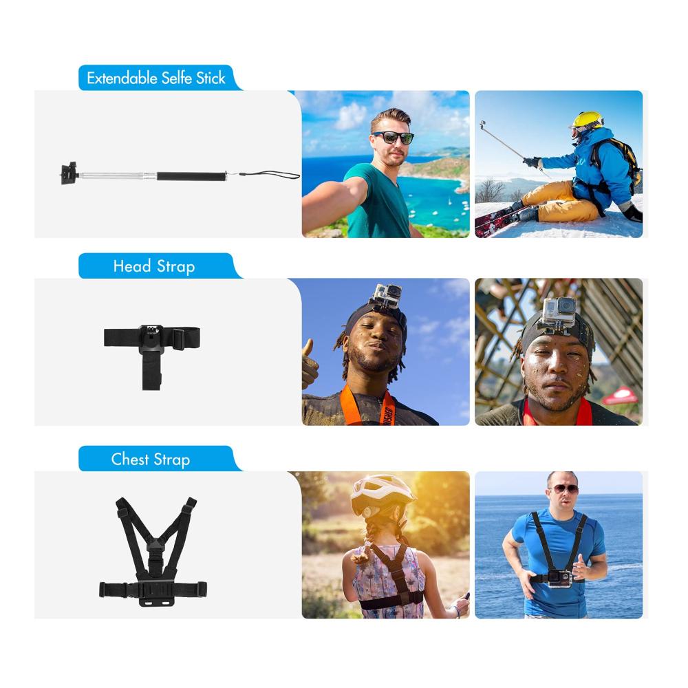 Entdecken Sie das 48-in-1 Action-Kamera Zubehör Set, das perfekt für Ihre Abenteuer geeignet ist! Kompatibel mit einer Vielzahl von Action-Kameras auf dem Markt, bietet dieses Set alles, was Sie benötigen, um erstaunliche Momente festzuhalten und Ihre Kamera optimal zu schützen. Von drehbaren Armbändern und Clip-Halterungen bis hin zu verstellbaren Kopf- und Brustgurten – dieses Set ermöglicht es Ihnen, flexibel zu filmen und Ihre besten Momente festzuhalten. Die Auto-Saughalterung und die Fahrrad-Lenkerhalterung sorgen dafür, dass Ihre Kamera sicher angebracht ist, während der ausziehbare Selfie-Stick und das Mini-Oktopus-Stativ Ihnen ermöglichen, perfekte Aufnahmen zu machen, egal wo Sie sind. Bereit für unvergessliche Erlebnisse? Dieses Zubehör Set macht es möglich!
