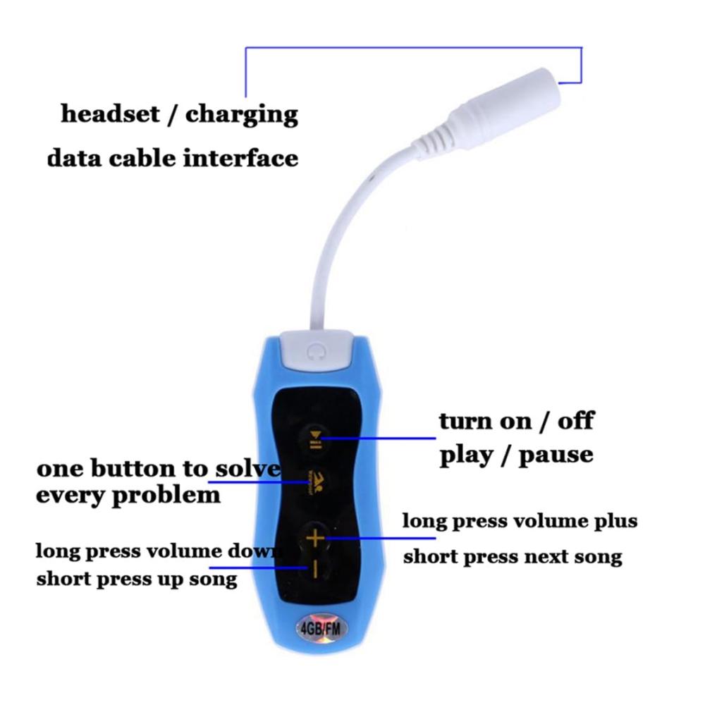 Bakkeny Wasserdichtigkeit: IPX8.Maximale Unterwassertiefe: 10 m/32,8 Fuß.Unterstützte Mediendateien: MP3/WMA/WAV.FM: 87 MHz ~ 108 MHz.Stromversorgung: Eingebauter Lithium-.Ladezeit: Ca. 2 Stunden.Spielzeit: Ca. 6-8 Stunden.Farbe: C: Blau (4 GB)Material: KunststoffPaketinhalt:1 x MP3-PlayerNur der oben genannte Paketinhalt, andere Produkte sind nicht enthalten.Hinweis: Wegen der Lichtreflexion und Bildschirme könnte der Farbeton in den Fotos sowie des tatsächlichen Produkts etwas unterschiedlich sein. Der erlaubte Messfehler ist /- 1-3 cm.