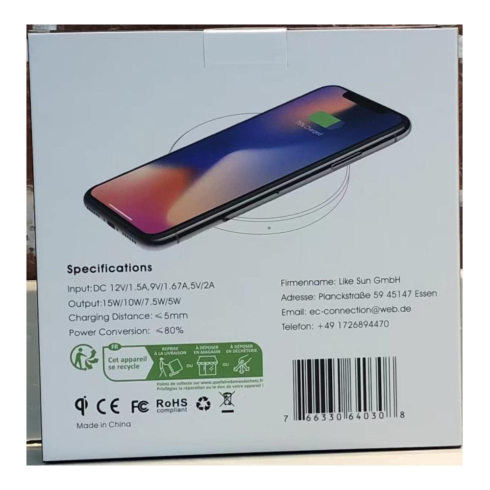 - Eingebaute FOD (Foreign-Object-Detection). Wenn ein Metall/Magnetisches Objekt erkannt wird, blinkt die grüne LED und hört auf zu laden, um das Risiko einer Überhitzung zu vermeiden.