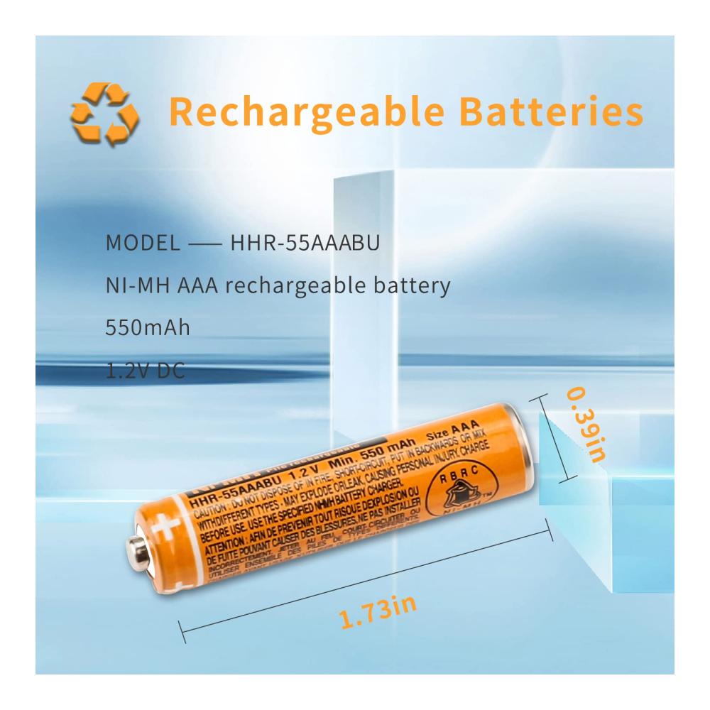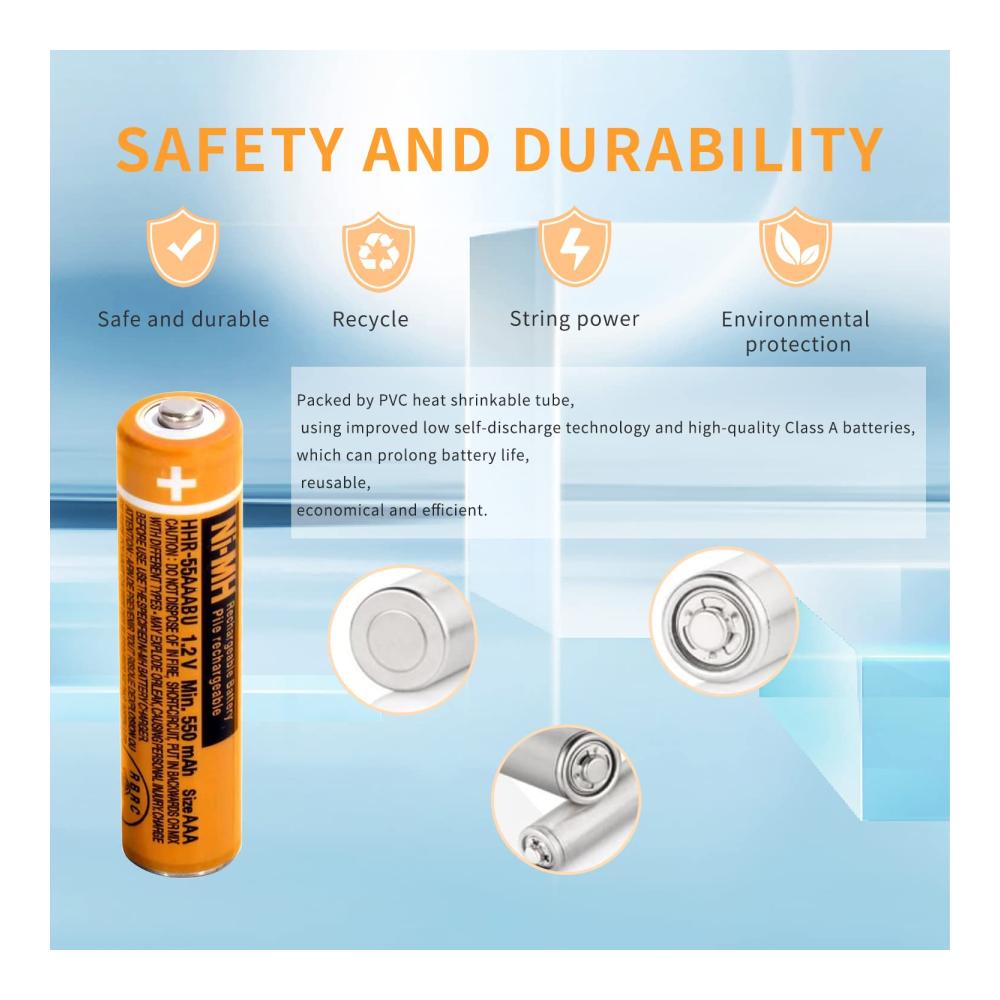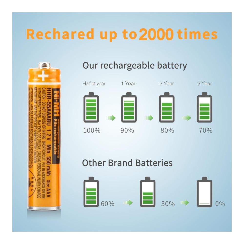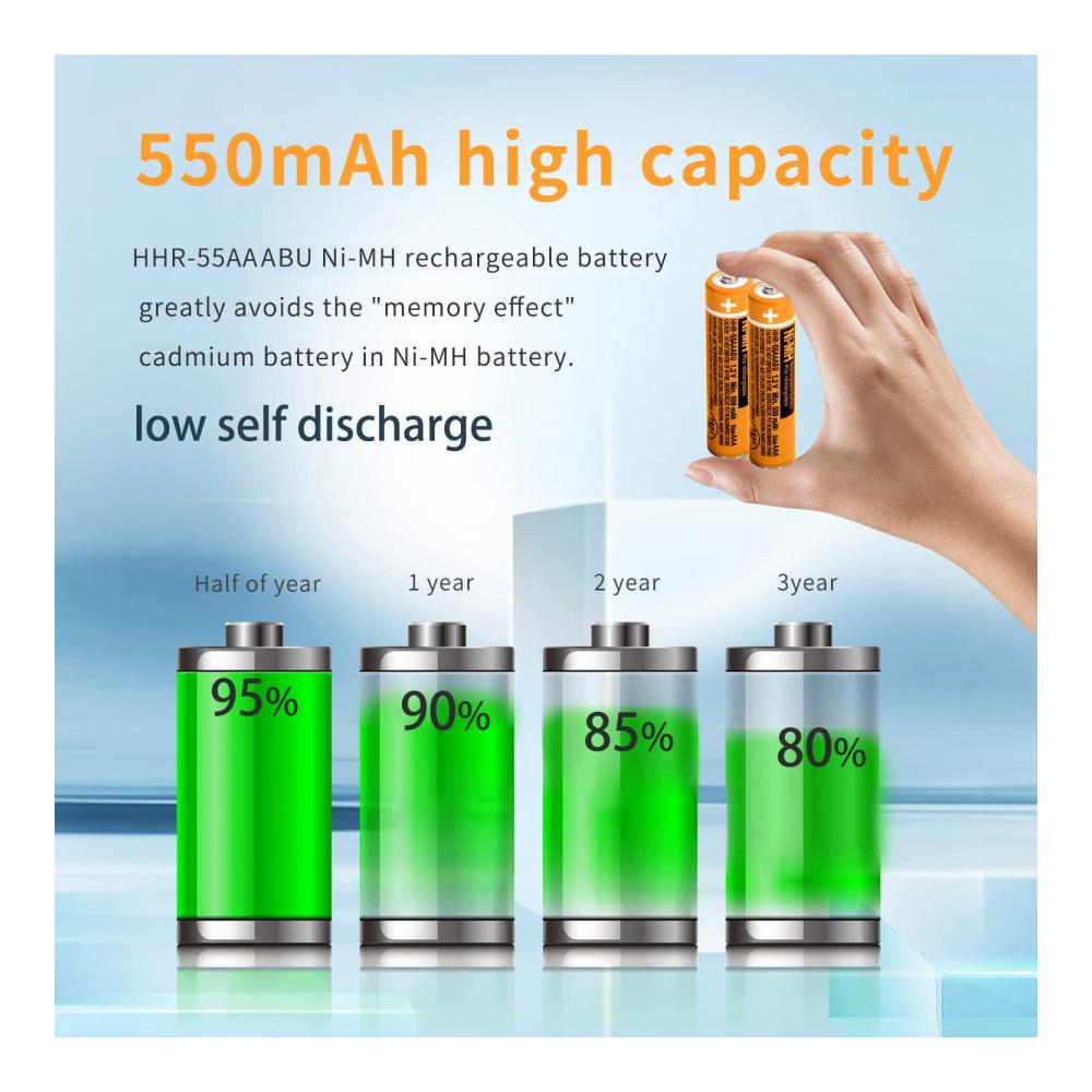 Kapazität: 550 mAh für ein schnurloses Telefon. NIMH AAA-wiederaufladbare Batterien können recycelt, bis zu 2000 Mal wiederaufladbar und eine ziemlich niedrige Selbstentladungsrate aufweist, die Ihre Kosten senken kann, ist die ideale Alternative zu Einwegbatterien.