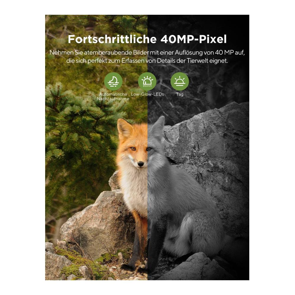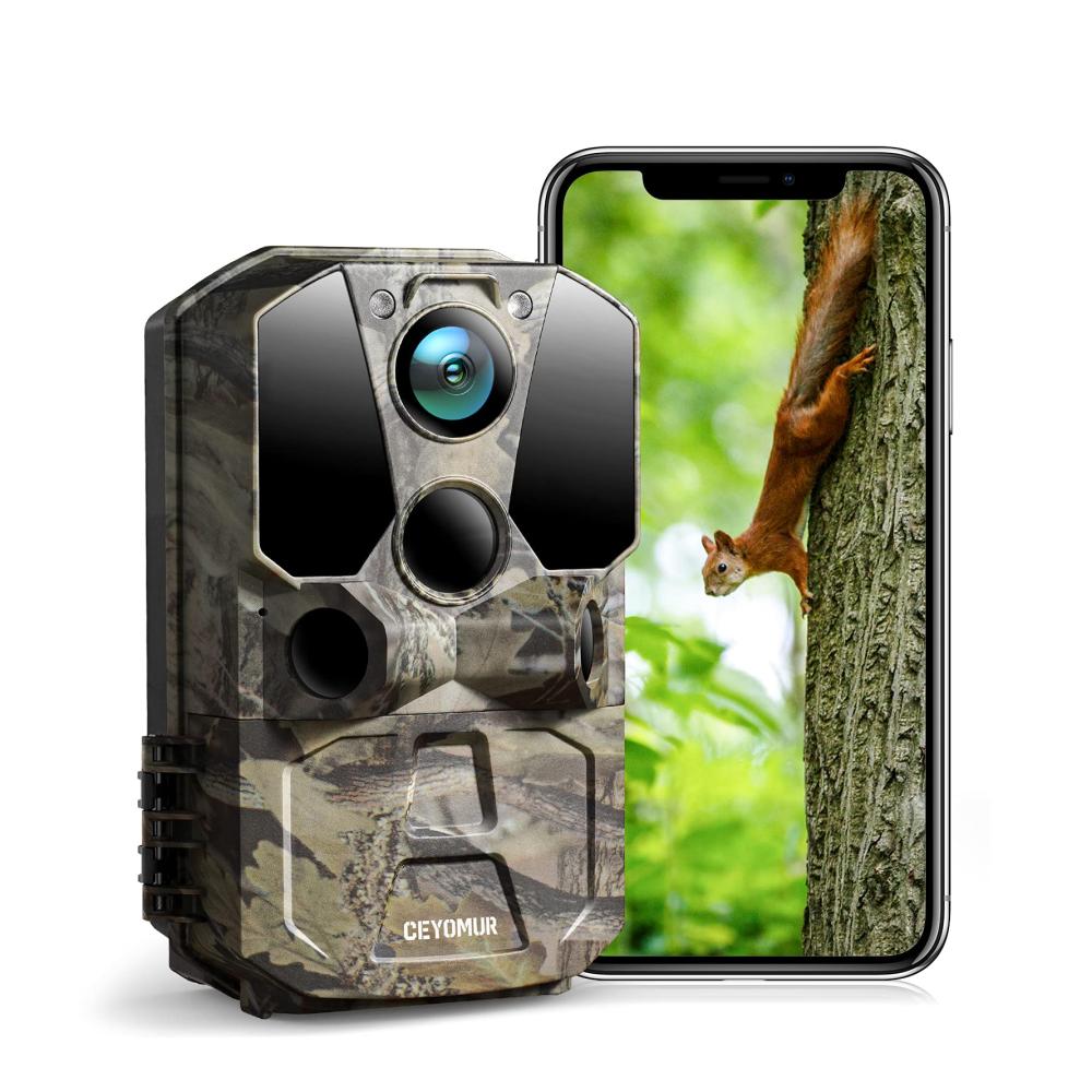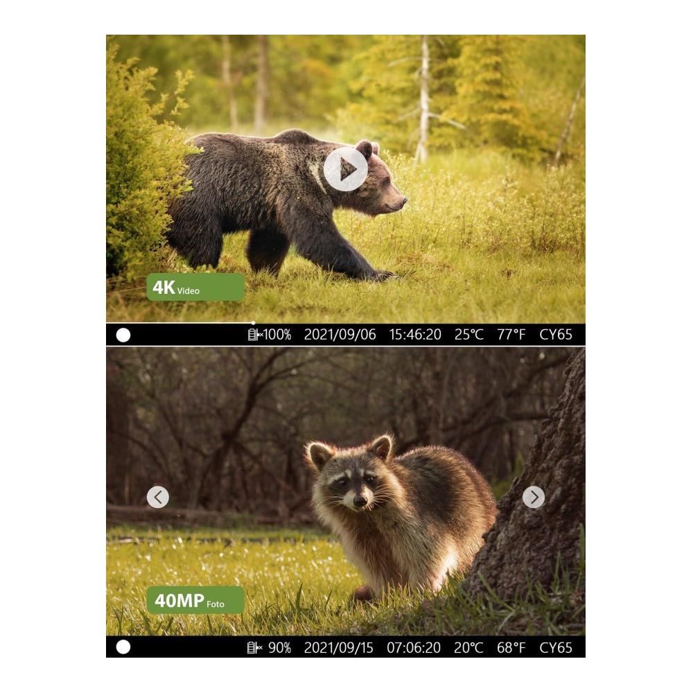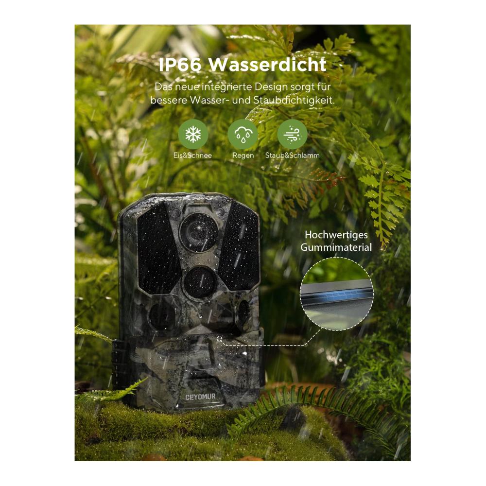 Die CEYOMUR 4K 40MP WiFi Wildkamera CY65 bietet eine herausragende Leistung für die Überwachung von Wildtieren, Bewegungserkennung und Nachtsicht. Mit einer drahtlosen Dateiübertragung und einem nach vorne gerichteten Display ist die Installation ein Kinderspiel. Erfassen Sie wunderbare Tiermomente in 4K-Audiovideos und 40MP-Bildern. Der 120° Erfassungswinkel und die 0,2s Auslösegeschwindigkeit garantieren, dass keine Bewegung entgeht. Diese Wildkamera ist für den Außenbereich geeignet und mit einem hochwertigen, wasserdichten Design ausgestattet. WICHTIG: SD-Karte, Netzadapter und Batterien sind nicht im Lieferumfang enthalten. CEYOMUR CY65 unterstützt SD-Karten bis zu 128 GB (Klasse 6 oder höher). (HINWEIS: Keine Micro SD-Karte mit Adapter verwenden; SD-Karte vor Verwendung formatieren)