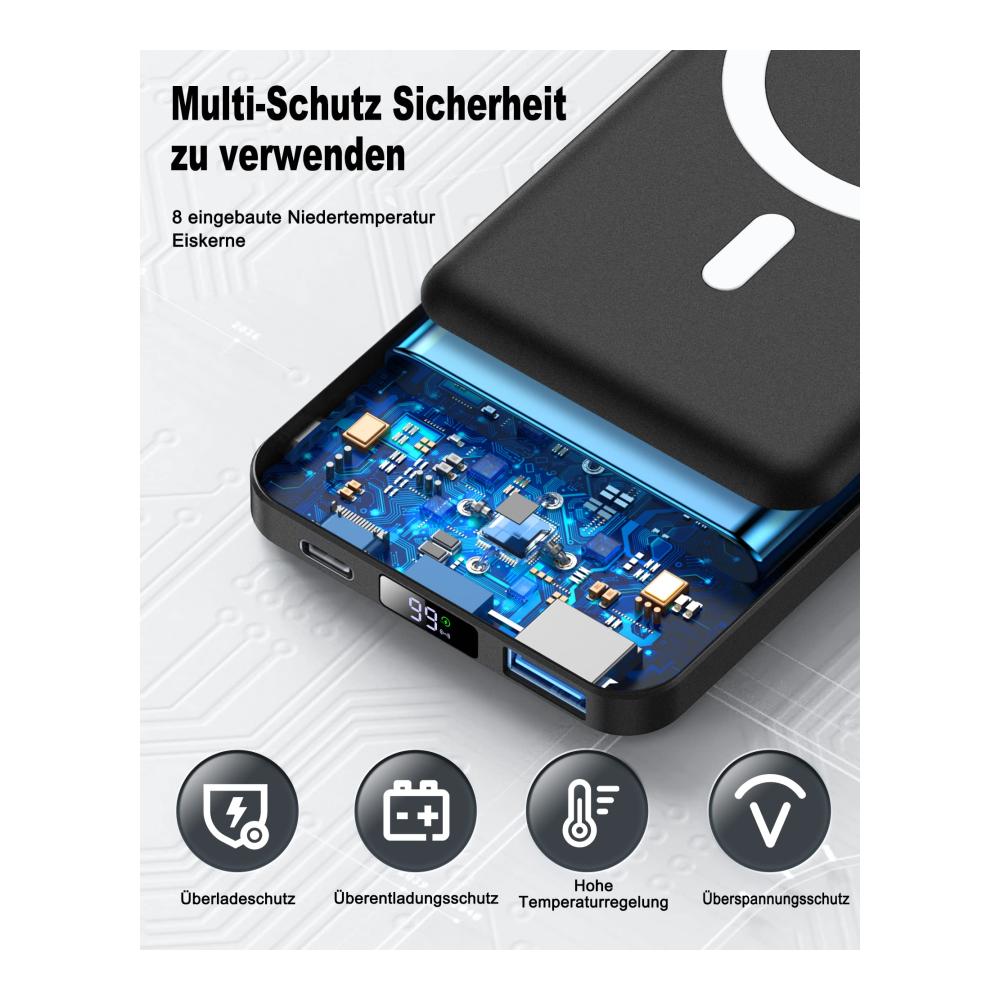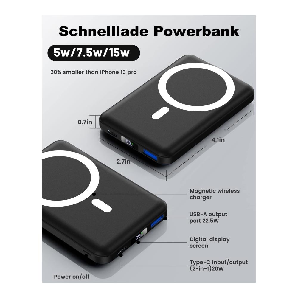 Die YAGOPAL MagSafe PowerBank 10000mAh ist eine leistungsstarke Lösung für unterwegs. Dank MagSafe und USB-C-Anschlüssen können Sie Ihr Gerät schnell aufladen. Das schlanke Design und die digitale Anzeige machen es einfach, den Ladestatus im Blick zu behalten. Erhältlich in elegantem Schwarz. Im Lieferumfang enthalten sind die Powerbank, ein Typ-C-Kabel und eine Bedienungsanleitung. Entdecken Sie jetzt die Freiheit des kabellosen Ladens!