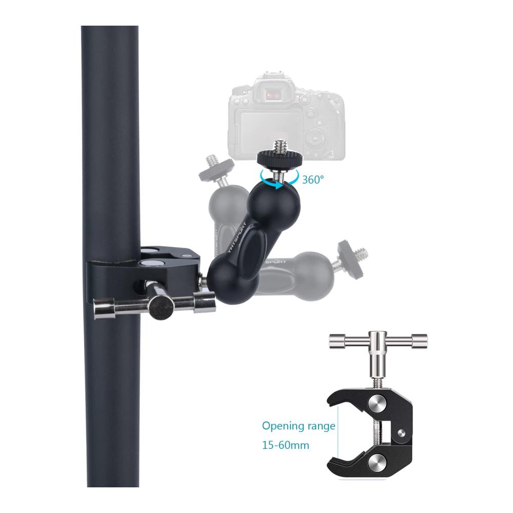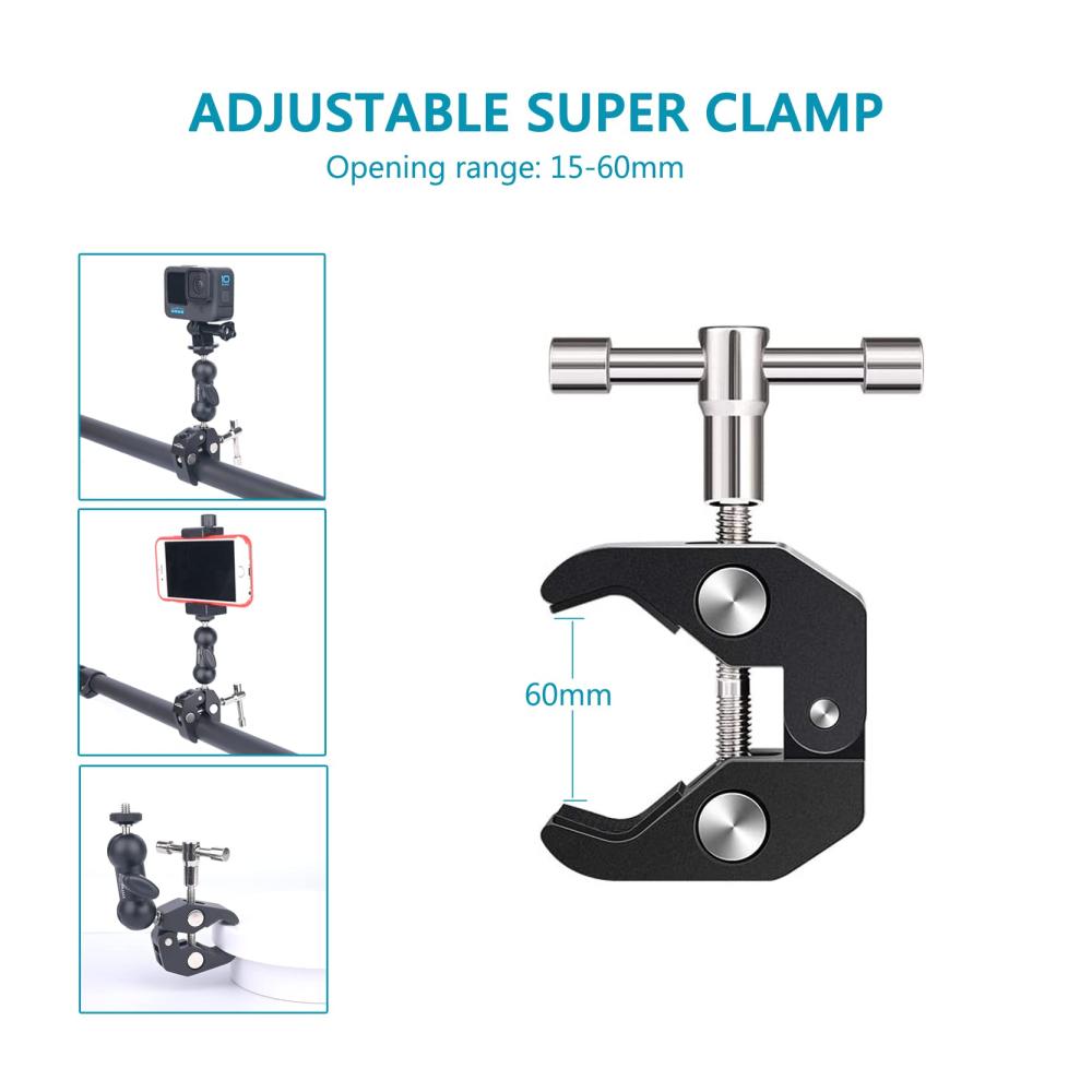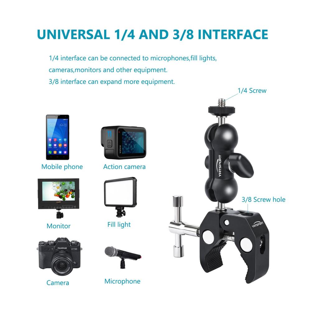 • 【Zubehör anschließen】Kommt mit Adapter und Telefonclip. 1/4&34; und 3/8&34; Innengewinde auf der Rückseite der Klemme helfen Ihnen bei der Montage einer kleinen Kamera, eines Monitors, einer LED Videoleuchte, eines Mikrofons, eines Speedlite und mehr. Der Telefonhalter kann verwendet werden, um Ihr Telefon zu halten, was nützlich ist, wenn Sie mit Ihrem Telefon fotografieren.