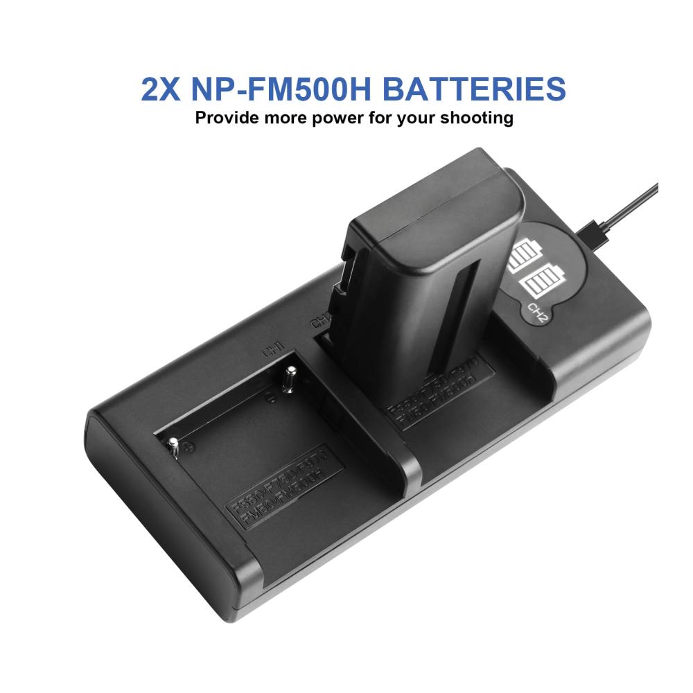 Unsere 2 X NP-FM500H Ersatz-Akkus und das Dual-Ladegerät sind perfekt für deine Sony Kamera-Akkus geeignet. Jeder Akku hat eine Kapazität von 2400mAh und eine Spannung von 7,2V. Kompatibel mit einer Vielzahl von Sony DSLR- und Alpha-Modellen, einschließlich A57, A58, A65 und mehr. Das Paket enthält 2 Ersatzbatterien und ein Dual Ladegerät für deine Bequemlichkeit. Halte deine Kamera immer einsatzbereit!